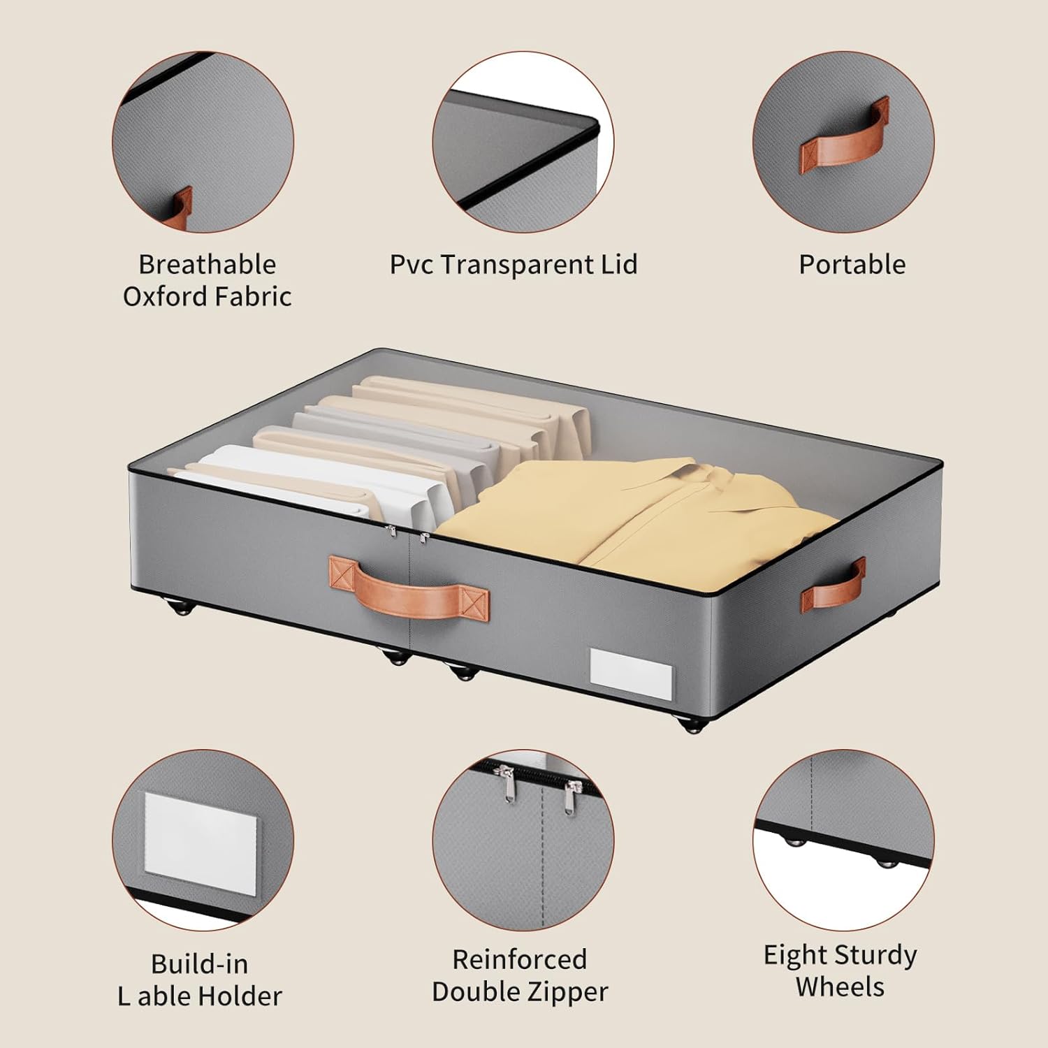 - [Strong Weight-Bearing Capability]: Made of durable oxford fabric, our underbed storage is built to withstand heavy weights. The bottom bracket is reinforced with hard wood, providing superior support compared to other elastic band structures. You can confidently store items weighing up to 40 pounds, such as books, However, when placing heavy objects above, please be careful to move slowly to prevent the wheels from being damaged by excessive lateral force!