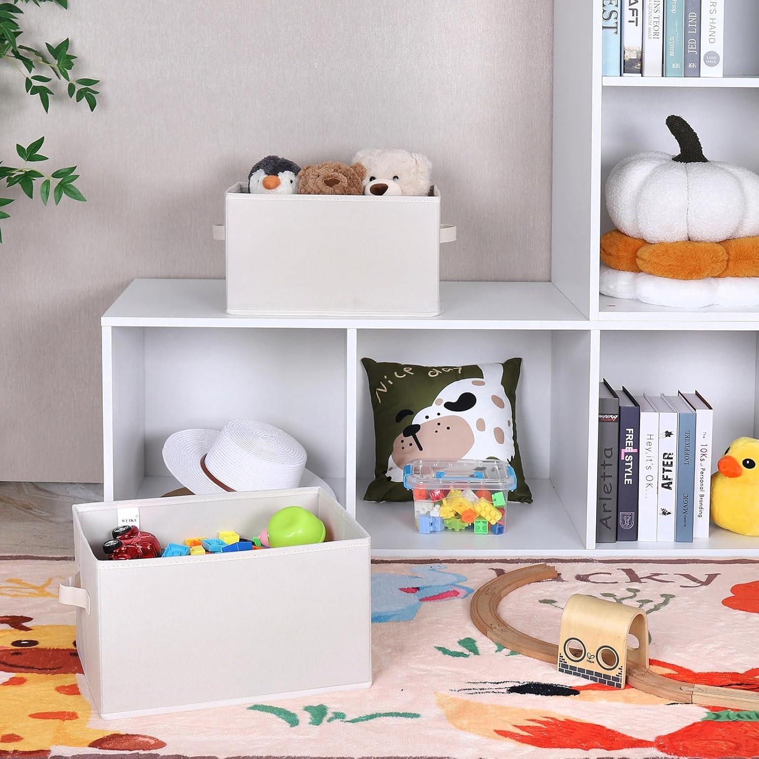 - Large Capacity & Lightweight: Measuring 14.4"L x 10"W x 8.5"H with 21L capacity, each bin weighs only 1.08 lbs. Includes 3 beige shelf baskets to match any home decor.