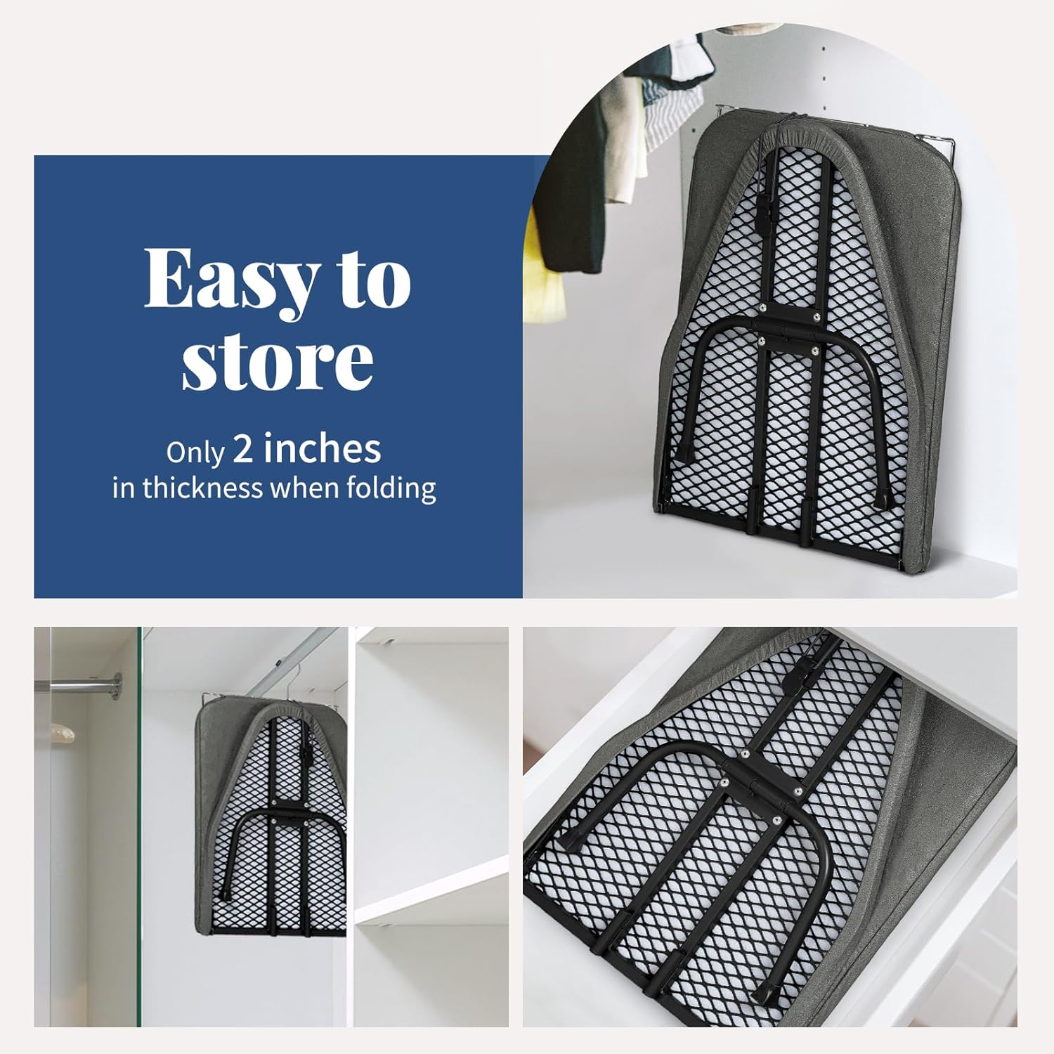 - Convenient Storage: This lightweight, foldable ironing board can be quickly folded in half for easy storage in cabinets, drawers, or hung in a closet, making it a practical solution for any space.