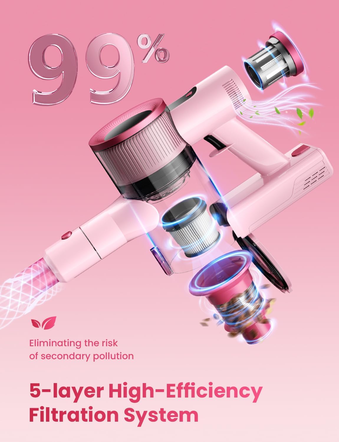 • 𝟱0𝗞𝗣𝗮 𝗣𝗼𝘄𝗲𝗿𝗳𝘂𝗹 𝗦𝘂𝗰𝘁𝗶𝗼𝗻 𝗳𝗼𝗿 𝗗𝗲𝗲𝗽 𝗖𝗹𝗲𝗮𝗻𝗶𝗻𝗴: Tackle dirt, dust, and pet hair with ease using the 350W brushless motor that delivers up to 50,000Pa of suction. This cordless stick vacuum cleaner works great on hardwood floors, carpets, tile, and more—perfect for whole-home cleaning.