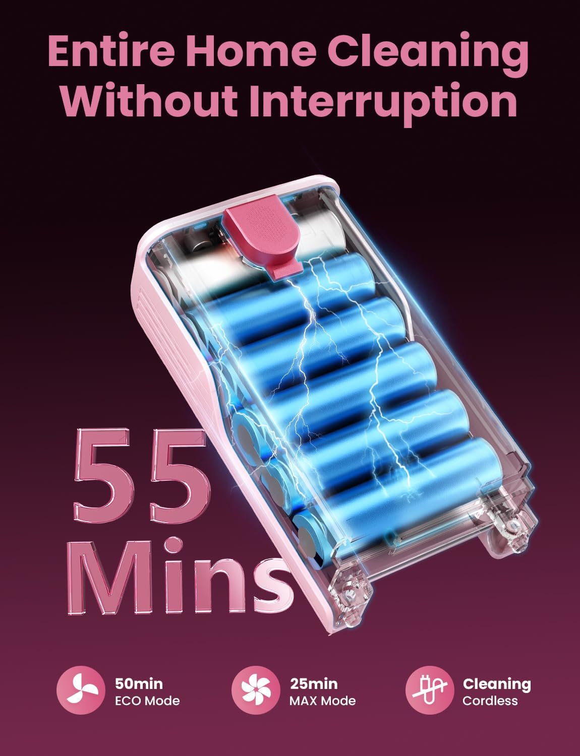 • 𝟱5𝗠𝗶𝗻𝘀 𝗥𝘂𝗻𝘁𝗶𝗺𝗲 𝘄𝗶𝘁𝗵 𝗥𝗲𝗺𝗼𝘃𝗮𝗯𝗹𝗲 𝗕𝗮𝘁𝘁𝗲𝗿𝘆: S2 cordless vacuum includes a 6x2500mAh detachable battery that provides up to 55 minutes of cleaning on Eco Mode, and 25 minutes on Max Mode. Easily swap batteries and recharge for extended use without interruption.