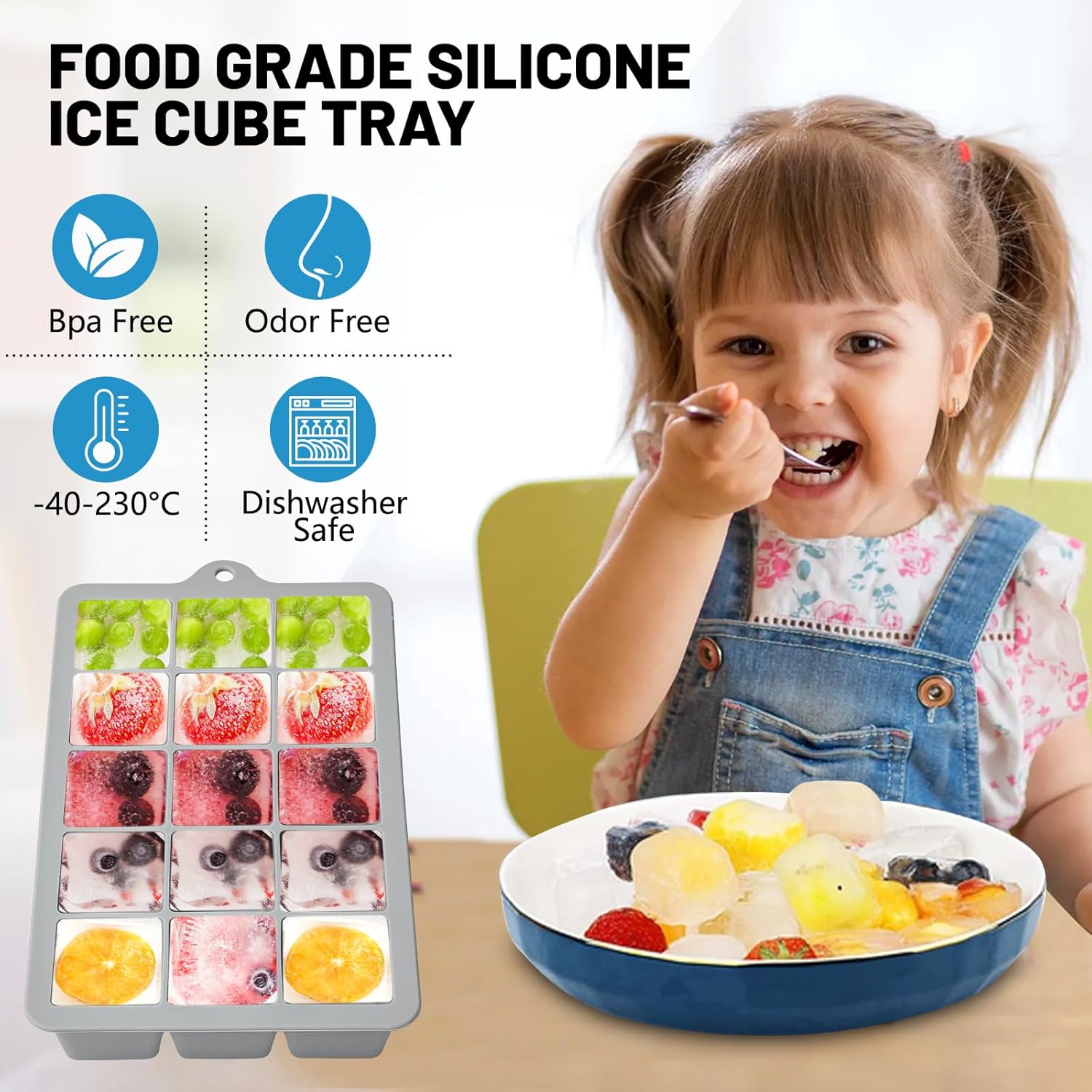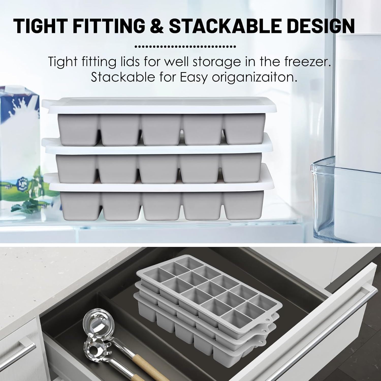 Silicone Ice Cube Trays 3Packs, Easy Release Ice Cube Molds with Lid, Freezer Stackable Ice Maker for Whiskey, Baby Food, BPA Free (Grey)