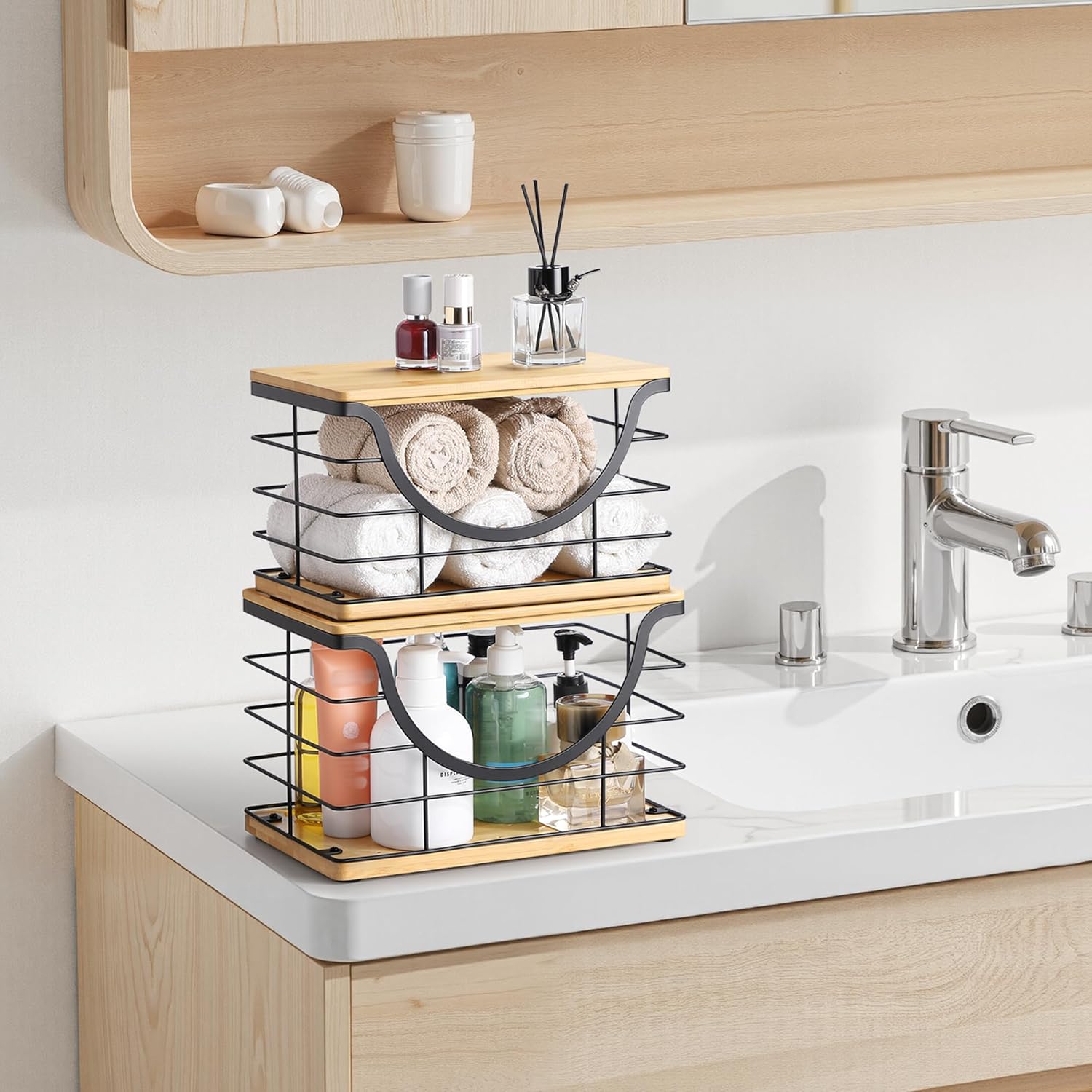 - 2 Ways to Use -stackable wire basket with bamboo top can be used on a tabletop or self-adhesive wall mounted. No need to drill holes, won't damage the wall. Multi-functional Garbage Bag Storage Dispenser is suitable for kitchen, laundry room, toilet, under the sink, cabinet, etc., you can store laundry supplies, cleaning supplies, vegetables and fruits, snacks and so on