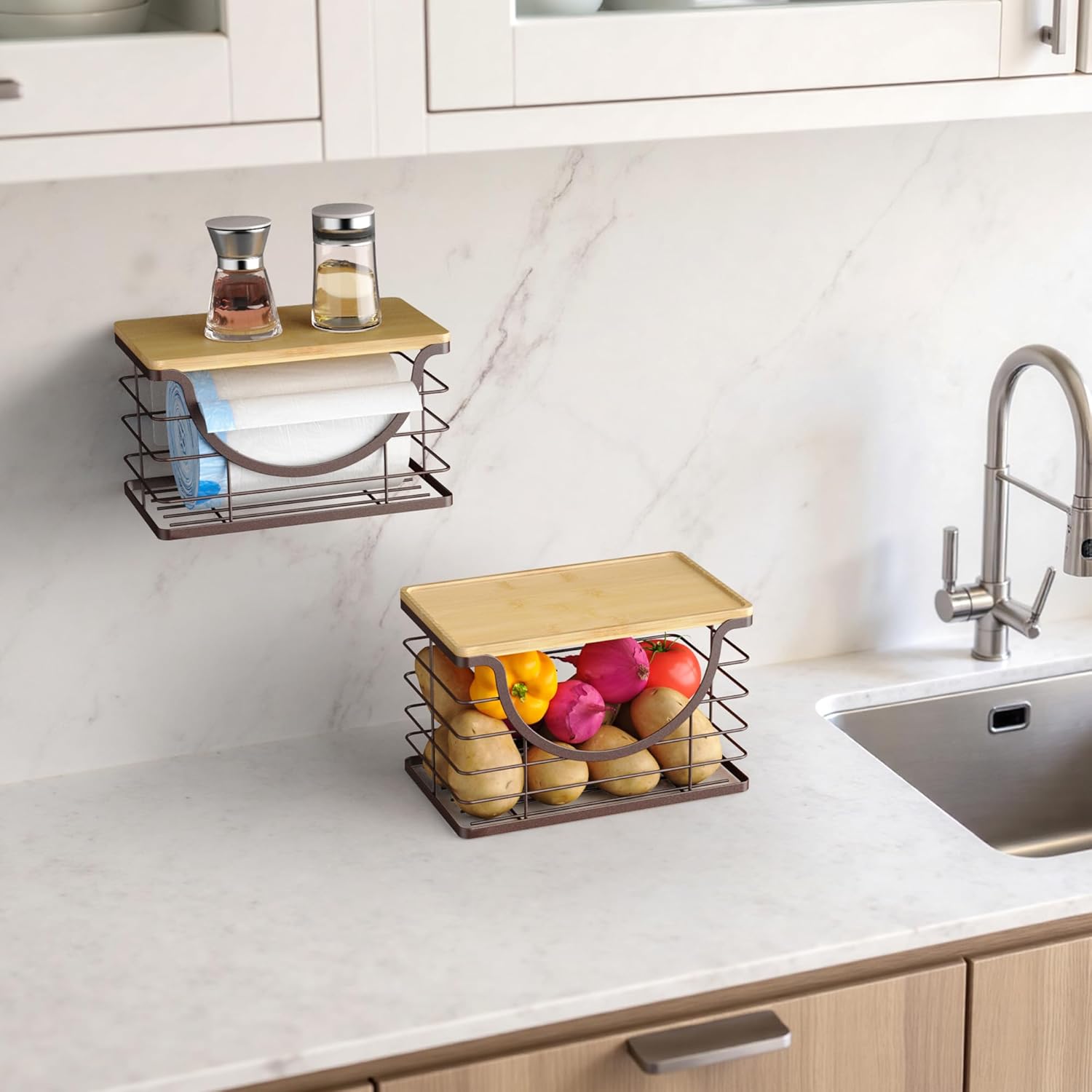 - 2 Ways to Use -stackable wire basket with bamboo top can be used on a tabletop or self-adhesive wall mounted. No need to drill holes, won't damage the wall. Multi-functional Garbage Bag Storage Dispenser is suitable for kitchen, laundry room, toilet, under the sink, cabinet, etc., you can store laundry supplies, cleaning supplies, vegetables and fruits, snacks and so on