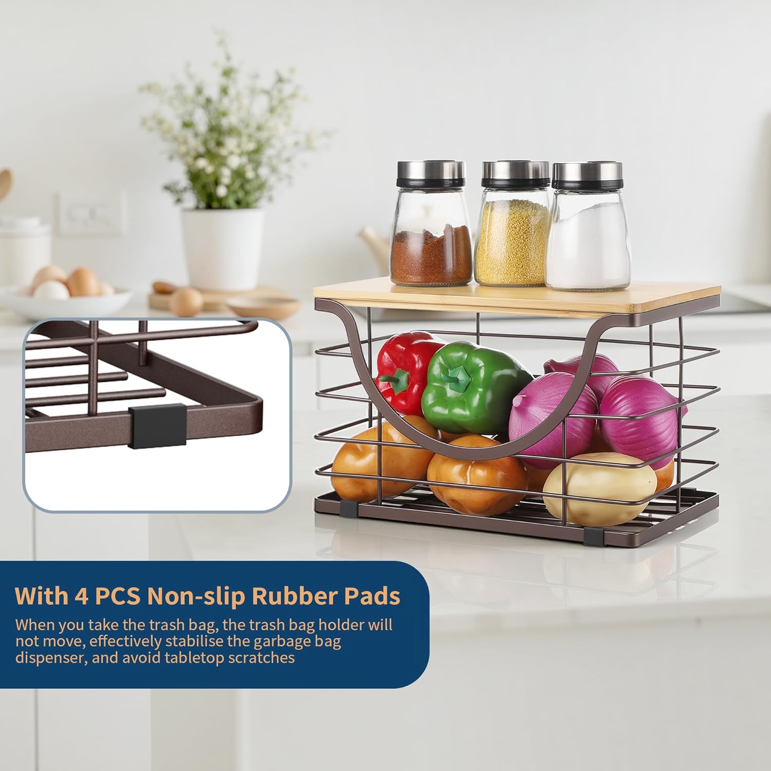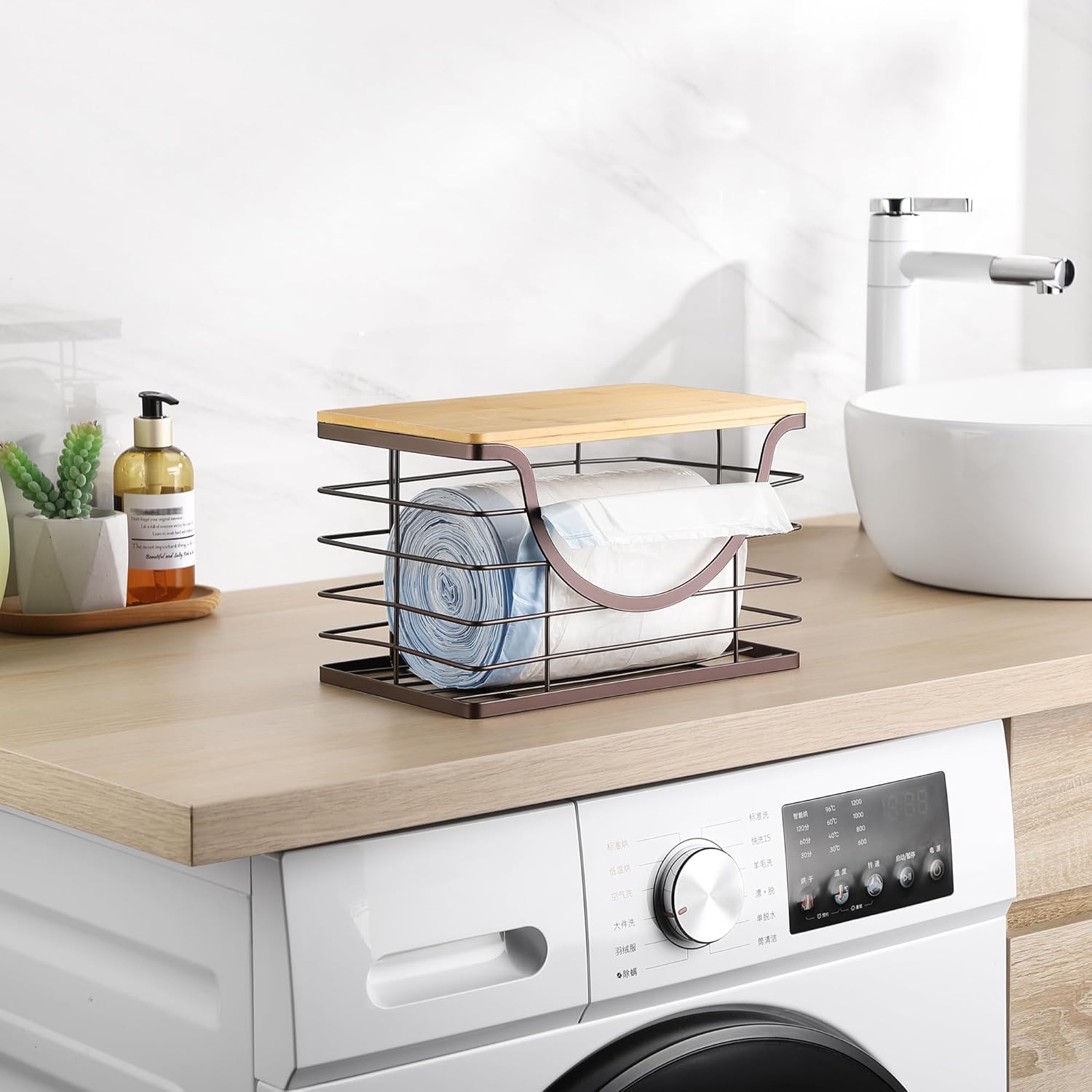 - High Quality and Fine Workmanship - Trash Bag Holder Dispenser is made of stainless steel basket and bamboo lid, corrosion and rust resistant, smooth edges, sturdy and durable. Hollow out design allows you to see the household items inside, easy to check your trash bag and replenish it at any time