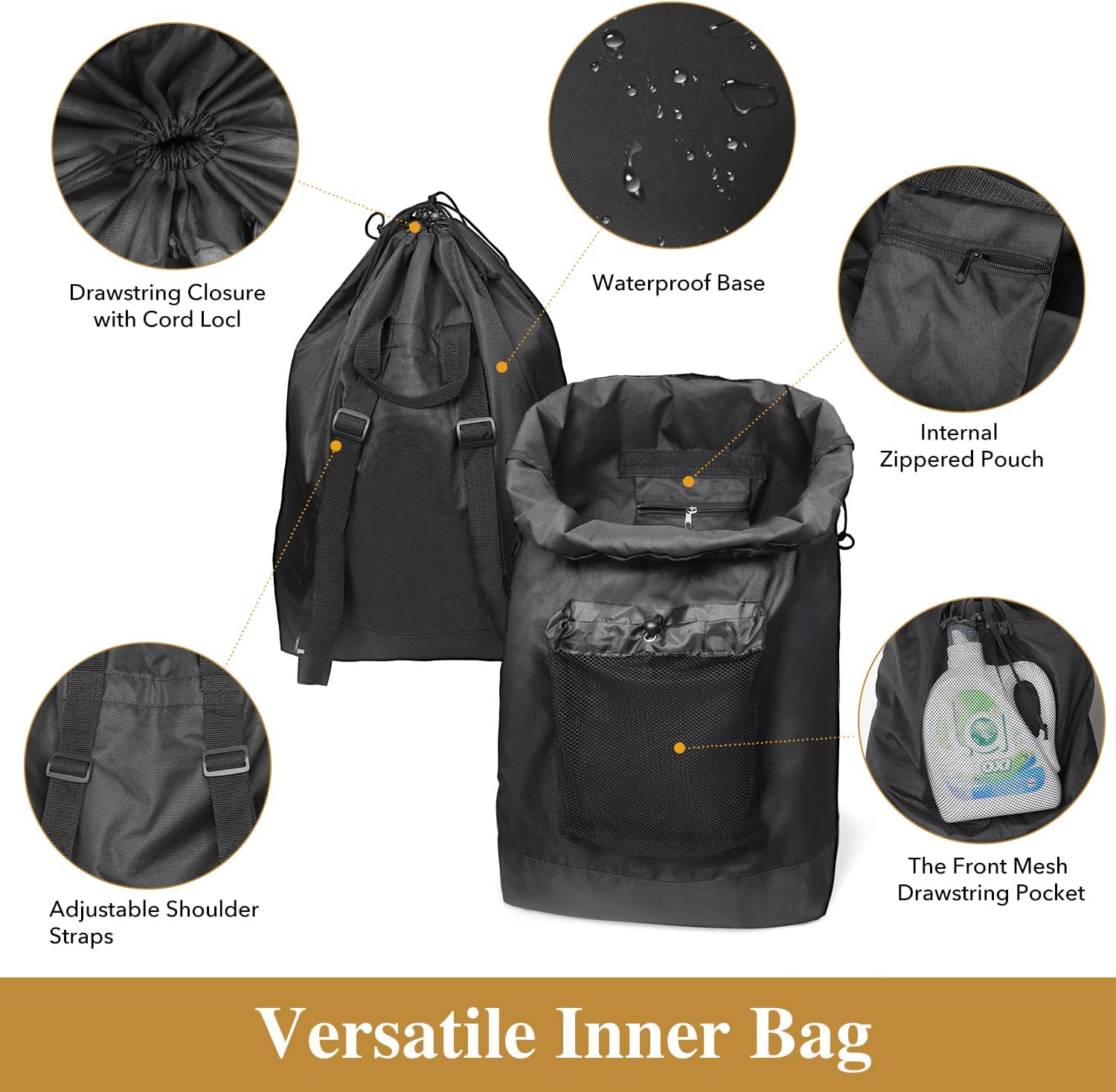 - Versatile Inner Bag: This laundry bag backpack features 1.9-inch wide adjustable shoulder straps for enhanced comfort when transporting laundry. The front mesh drawstring pocket offers extra space for detergent or fabric softener, while an internal zippered pouch securely holds items like phones or coins.