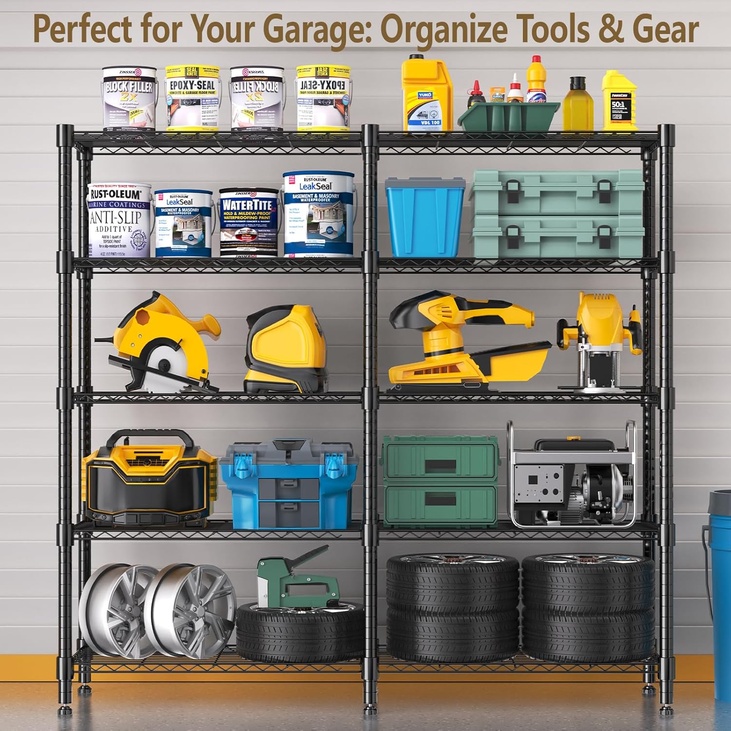- 【LARGE CAPACITY】Our heavy duty shelving is constructed from robust carbon steel with 19mm metal rods, supporting up to 300LBs per shelf on leveling feet, with a total bearing capacity of 1500LBS.