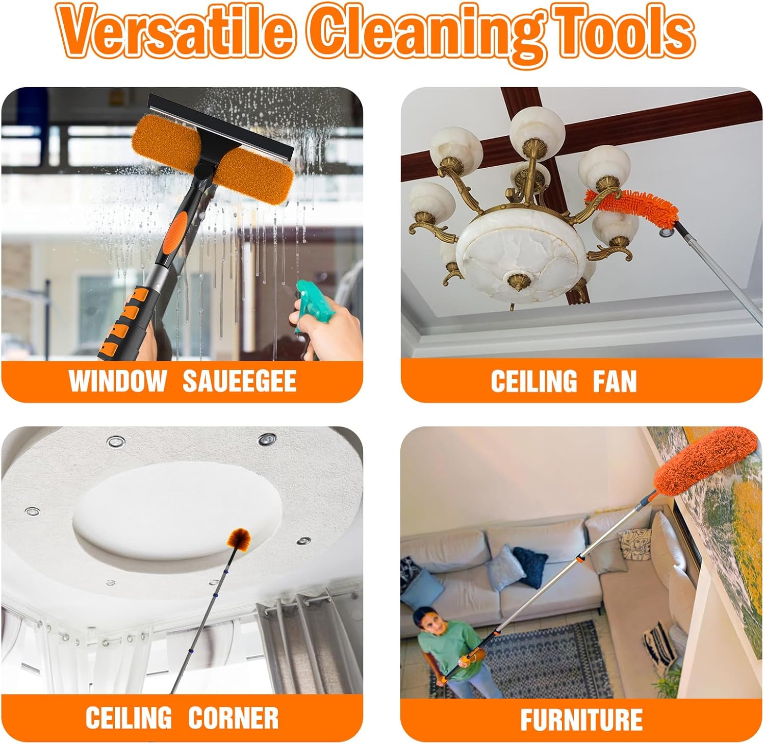 - Universal Joint, Compatible with Various Cleaning Accessories: The universal joint on the pole can connect a variety of dusters for cleaning heads and other cleaning accessories, such as window squeegee, cobweb duster, light bulb changers, and more. This transforms the pole into a versatile ceiling fan cleaner duster set, enabling you to use it for multiple cleaning tasks. Use this extendable duster to keep dirt and stains at bay.