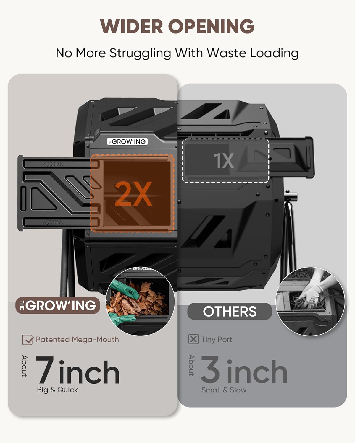 - Dual-Chamber System for Continuous Composting: Unlike single-barrel options, our dual chamber compost tumbler lets you keep one side composting while you fill the other. This keeps the cycle going with no delays. It's the ultimate compost maker for turning food and yard waste into rich soil on repeat. Whether you're into composting bins, composters tumbling or rotating outdoor, or just need a smart compost box, this bin keeps your garden nourished all year long.
