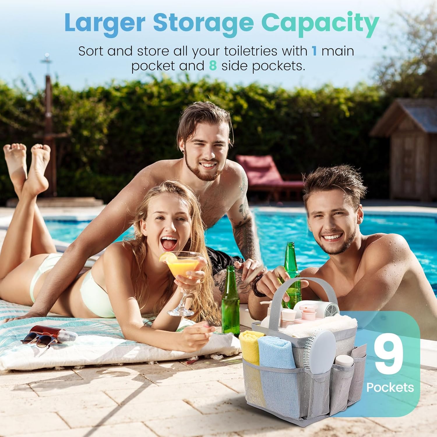 - Larger Capacity with 9 Pockets:The spacious mesh shower caddy gets 1 large center pocket and 8 side pockets to store all the essentials. A middle pocket fits larger items like shampoo, towels, and hair dryers, while side pockets fit smaller items like toothbrushes, facial cleansers, and razors.