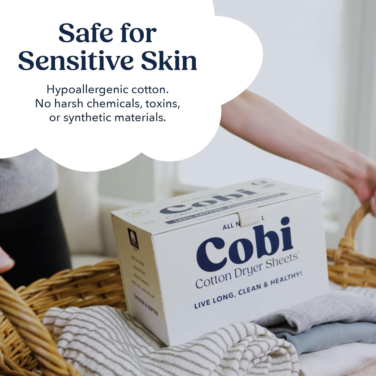 Cobi Eco-Friendly Dryer Sheets - 100% Cotton Biodegradable Non-Toxic & Unscented for Sensitive Skin, Clean Plant-Based Static Control, 120 Count