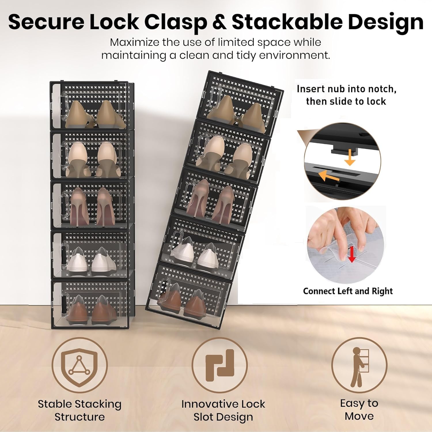 - Superior Shoe Organizer Solution: The lids of shoe boxes securely close to keep contents dust-free than traditional racks and provide better ventilation than closed shoe cabinets. Keeps your shoes fresh and dry while ensuring that they stay in great condition.