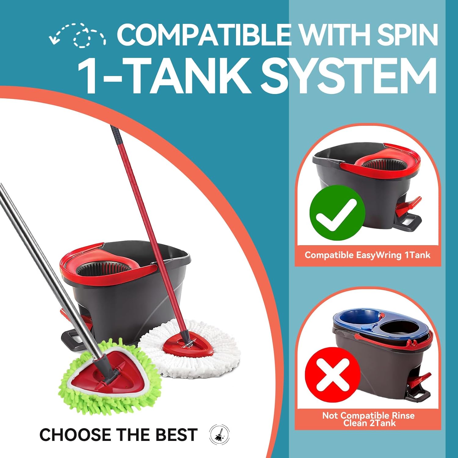 - 360° Rotating Design for Deep Cleaning:The spin mop head glides effortlessly into corners, edges, and under furniture, ensuring complete floor coverage with minimal effort.The mop head is not compatible with the 2-tank system,only fits for 1-tank mop system.