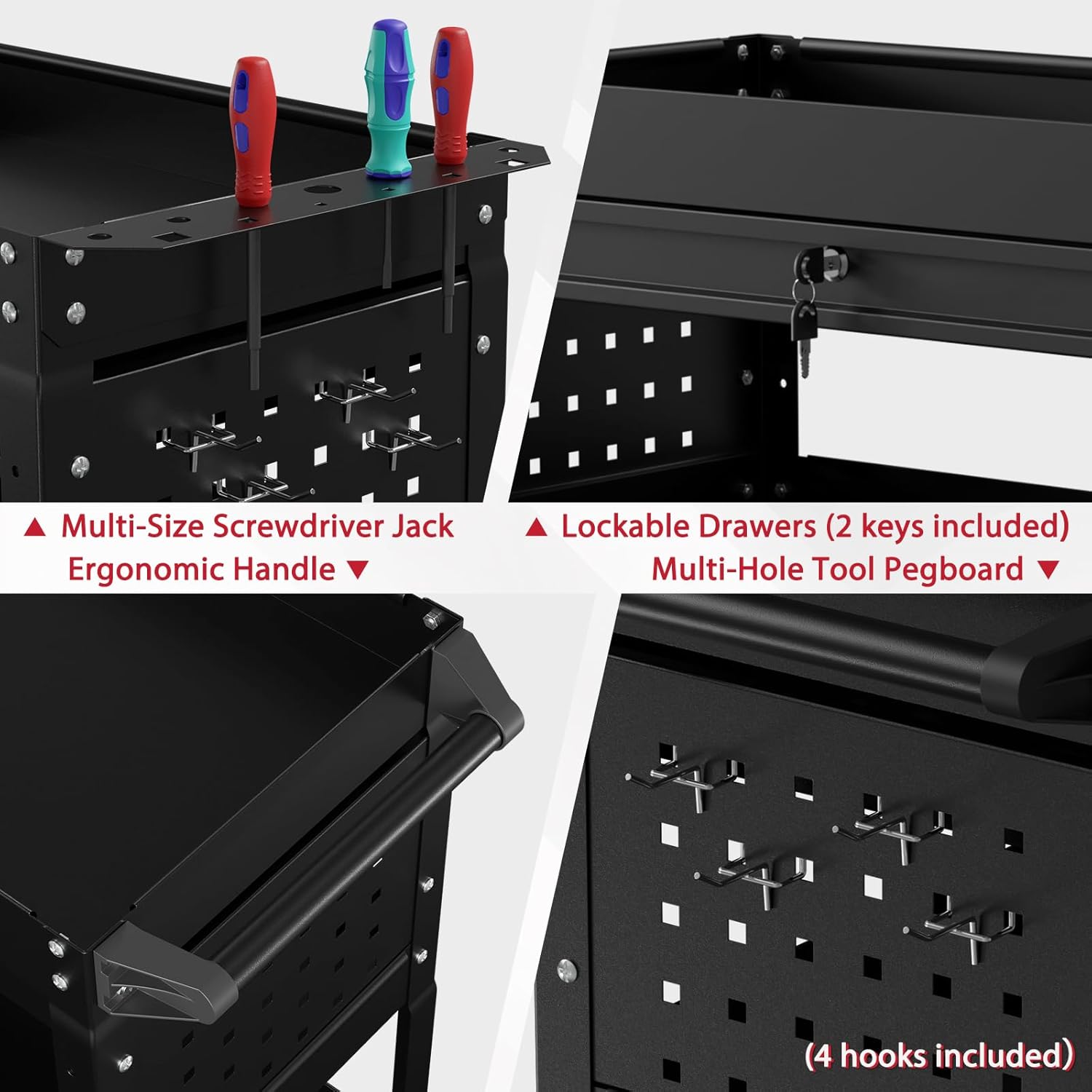 - 🧰【Spacious Storage】: Featuring a 3 tray design with a lockable drawer, allowing you to organize your tools and keep them easily accessible. The hanging board and hole-shaped pegboard keep your screwdrivers, pliers, and other repair tools handy.