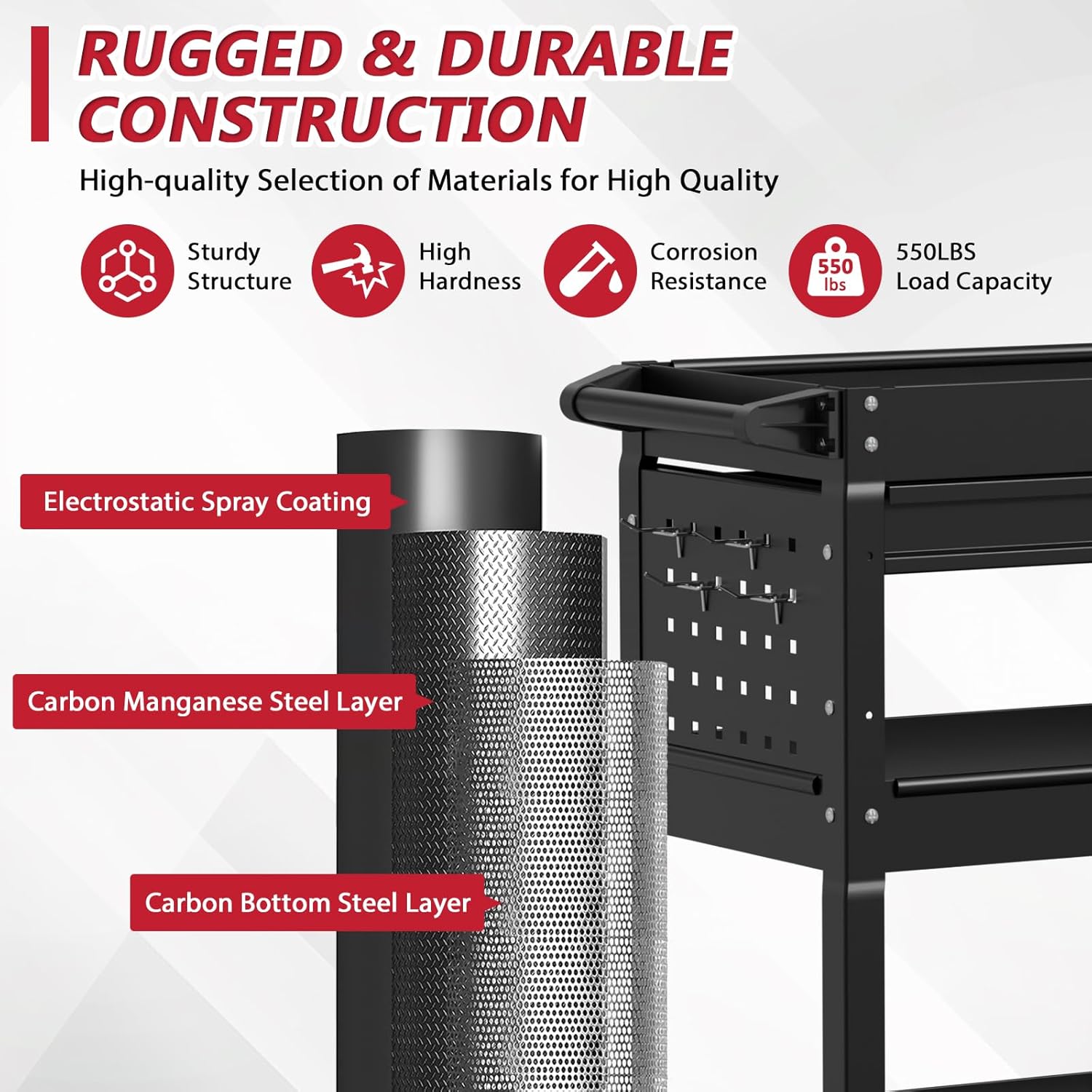 3 Tier Rolling Tool Cart on Wheels, Heavy Duty Service Cart Industrial Utility Cart with Drawer and Screwdriver Rack Pegboard, 550 LBS Mobile Tool Storage Organizer for Garage, Workshop(Black)