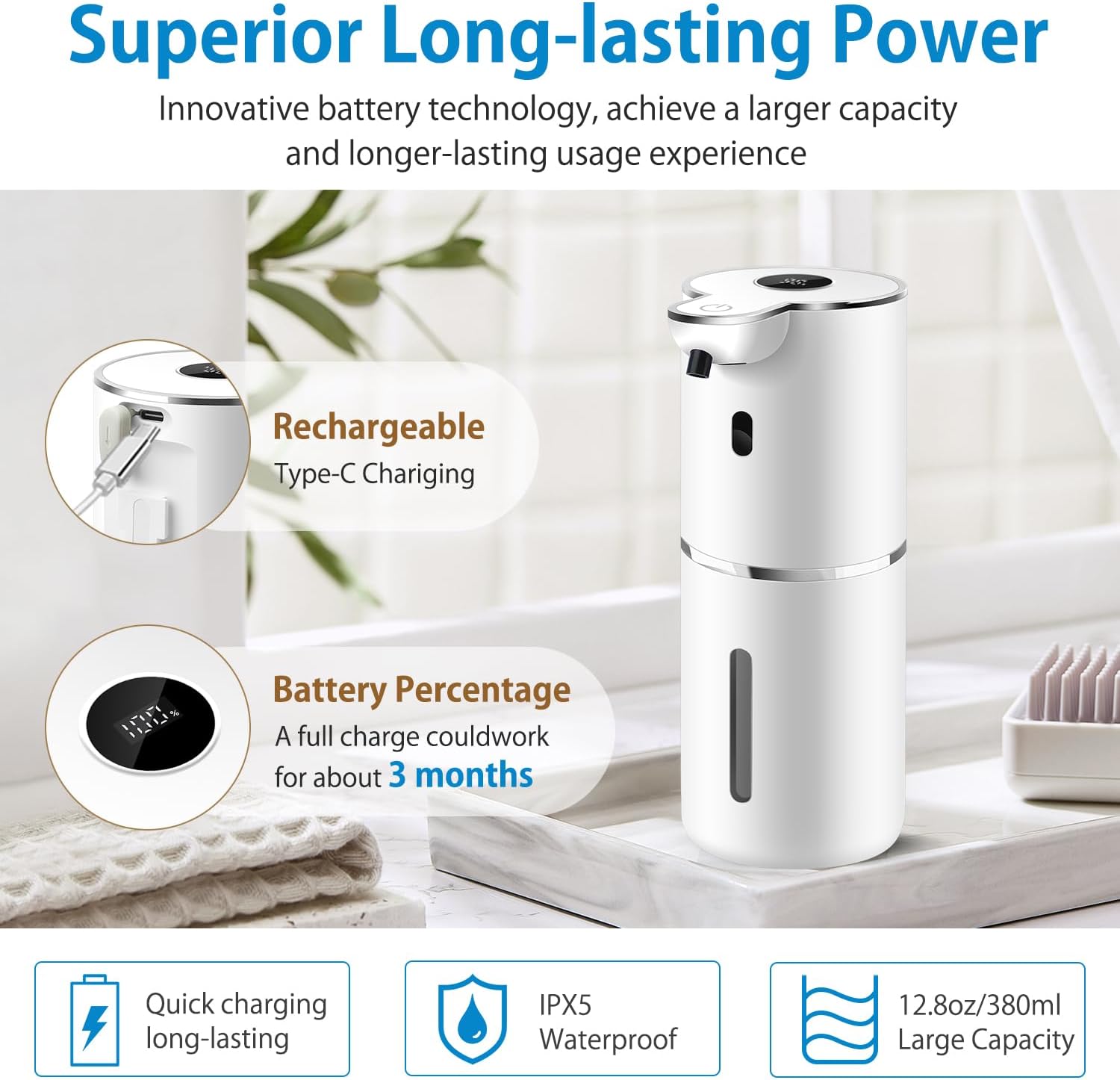 - 【Large Capacity & IPX5 Waterproof】Our touchless soap dispenser boasts a spacious 12.8oz capacity, minimizing the need for frequent refills. The translucent container allows for easy monitoring of soap levels, while the wide-mouth design simplifies refilling. With an IPX5 waterproof rating, it ensures durability and longevity, even in wet environments