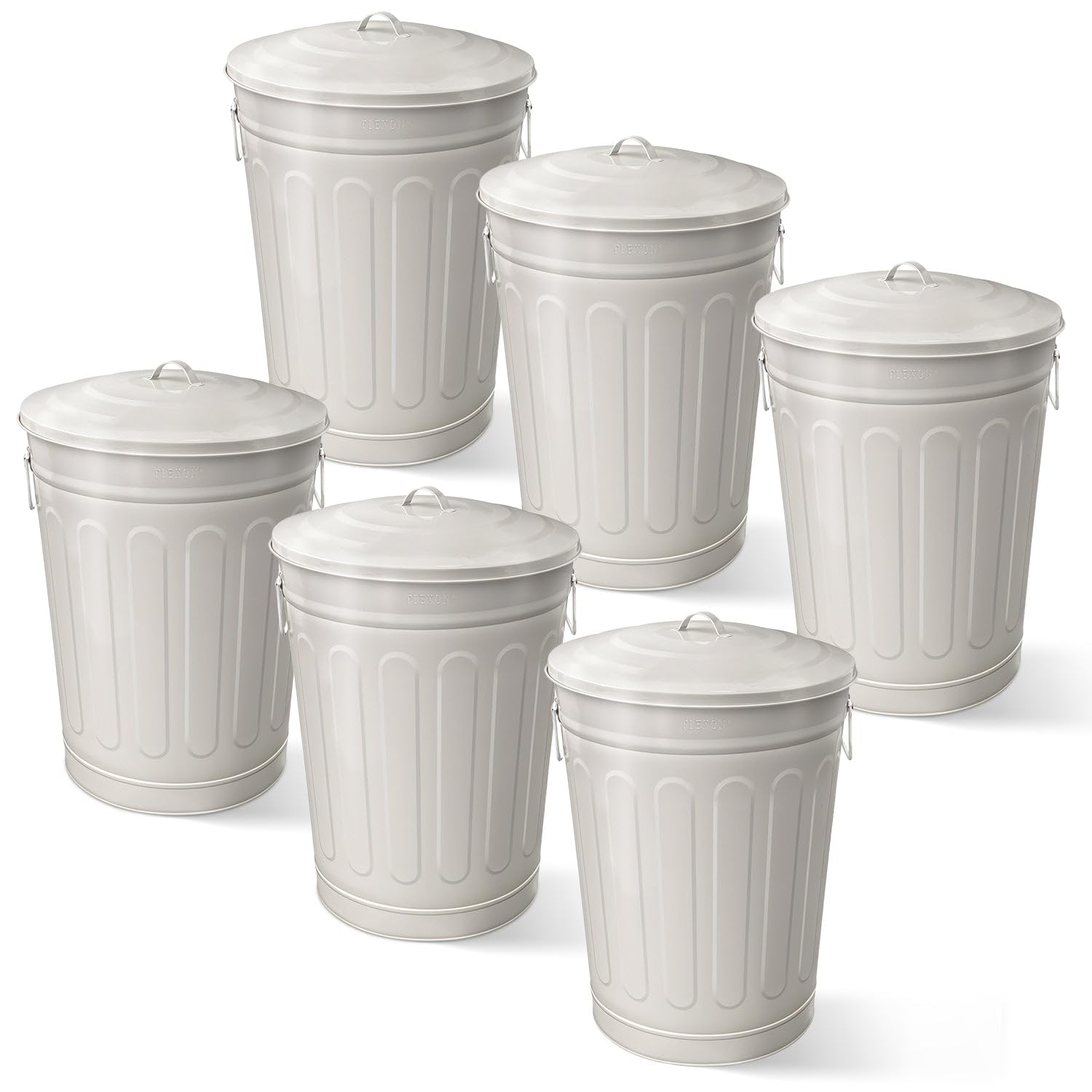 Plexon Round Trash Can 13 Gallon, Vintage Metal Outdoor Trash Can with Lid, Retro Farmhouse Garbage Container, Old School Modern Ash Bucket, Beige 6 Pack