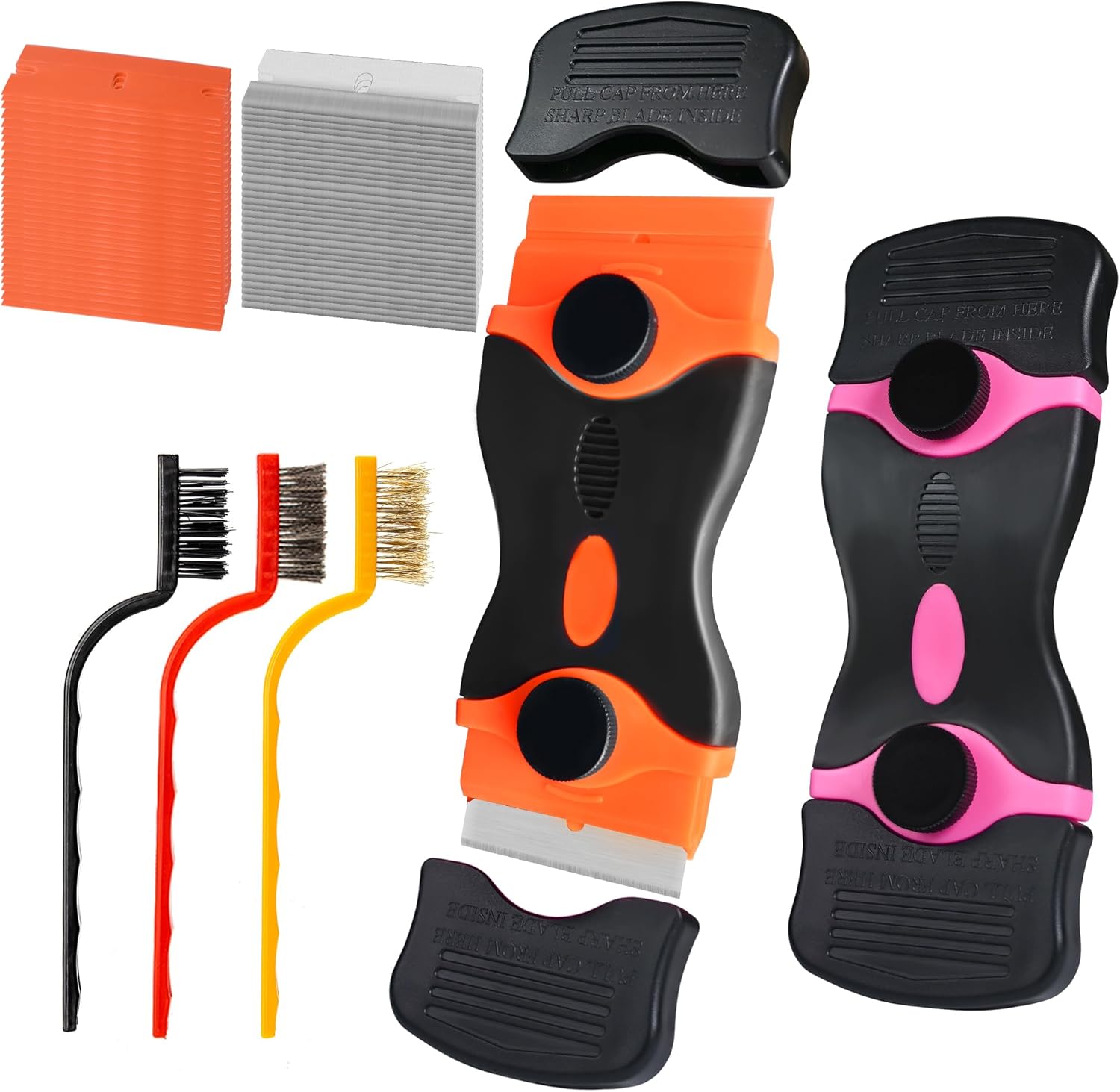 - 【Pack of 5 Razor Scraper Tools】 This pack includes two dual-head plastic scrapers, designed for versatility in various cleaning tasks. Additionally, it features three wire brushes for different applications and a total of 50 blades, ensuring you have everything you need for effective cleaning. Caution: There are sharp blades inside. Handle with care and keep out of reach of children.