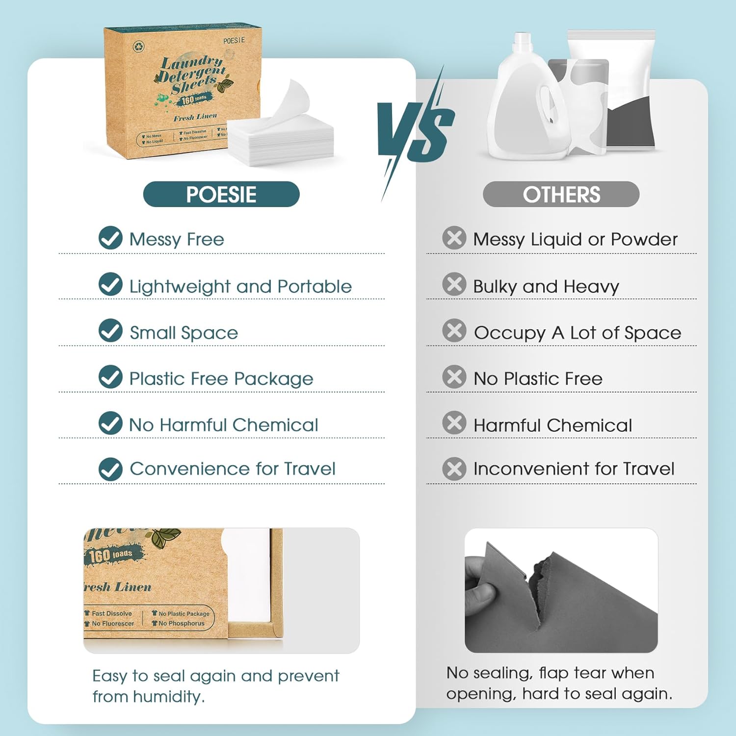 - Take it with you anytime - Say goodbye to heavy plastic jugs and pods, easy to pick up recyclable packaging and no pollution lightweight laundry tablets for your home, dorm or travel life