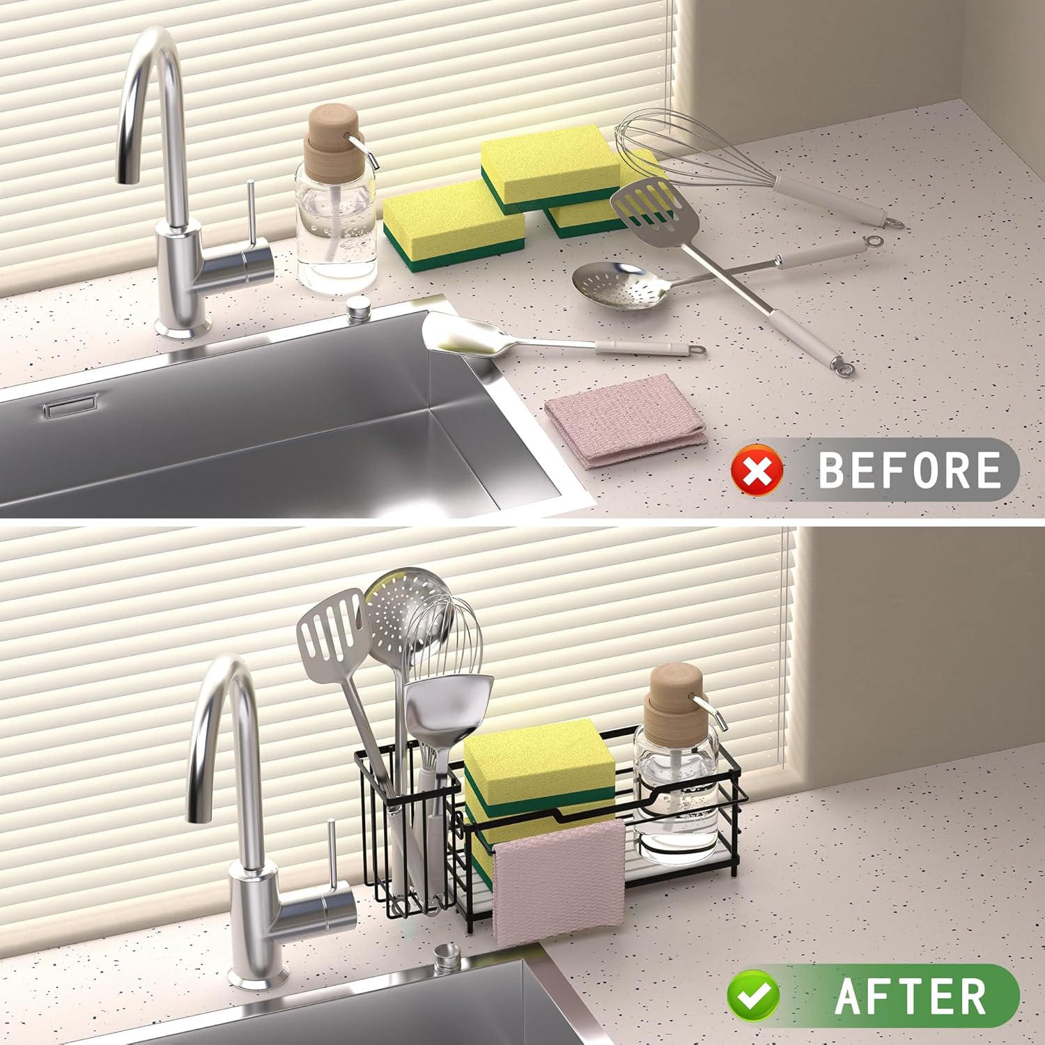 - Multi-Purpose Sink Organizer – Holds soap, sponges, scrub brushes, dish soap, and towels neatly in one place. Ideal for kitchen sink organization or bathroom counter organization.