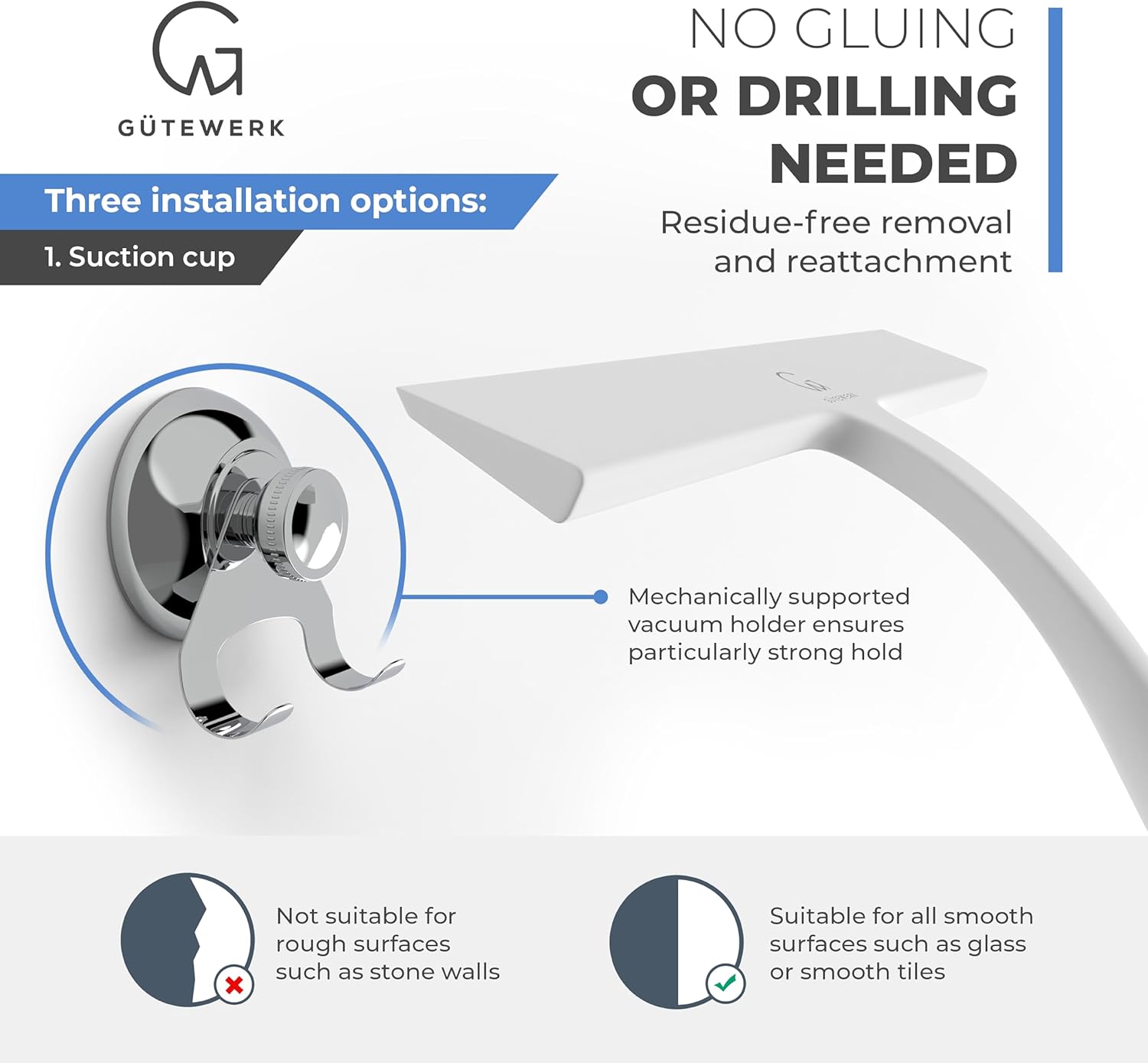 - MINIMALIST TIMELESS DESIGN - The GÜTEWERK glass squeegee is crafted with a matte black finish that impresses with its elegant timeless and smart design. In addition, the chrome-colored stainless-steel hook integrates well with any modern bathroom.