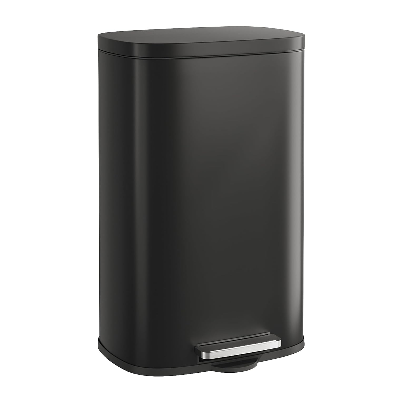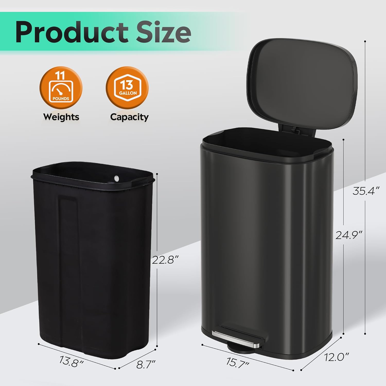WLIVE 13 Gallon Stainless Steel Trash Can with Inner Bucket, Kitchen Garbage Can with Lid, 50L Soft Close Step Trash Can with Metal Foot for Home, Kitchen, Laundry Room, Office, Black