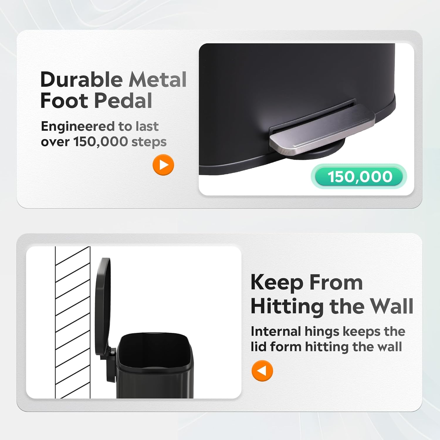 - Hands-free Operation: The ergonomically designed stainless steel foot pedal allows you to open the trash can easily without using your hands. When you need to change the garbage bag or perform a large-scale cleaning, simply push the lid to a 90° angle to keep it open.