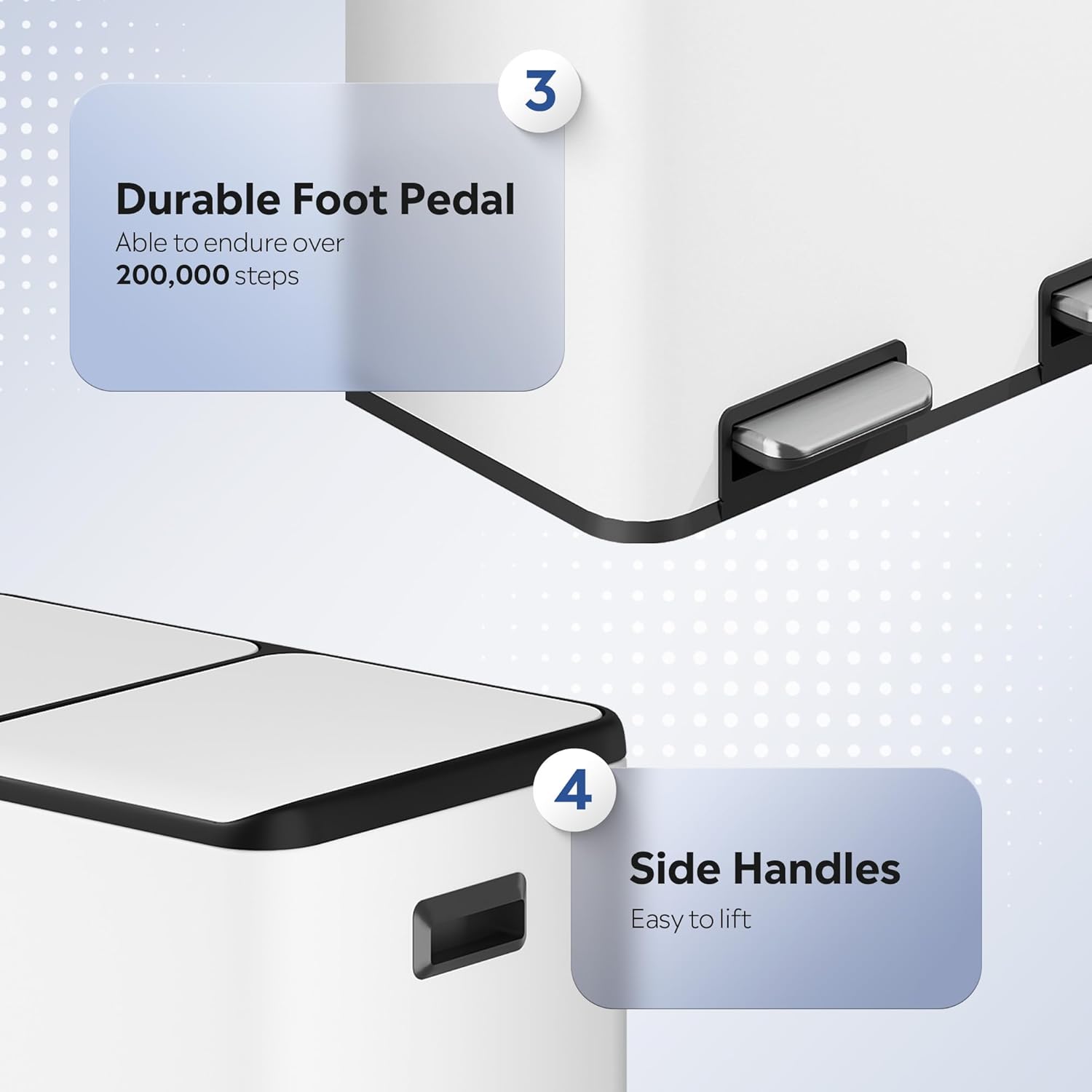 - 【Odor-Free & Hassle-Free Cleaning】The dual trash can’s sealed lid and built-in filter boxes (no deodorant needed) lock in odors, while the two removable inner buckets make cleanup effortless—even if bags leak. The inner handle lifts trash smoothly, keeping your kitchen trash can hygienic with minimal effort.