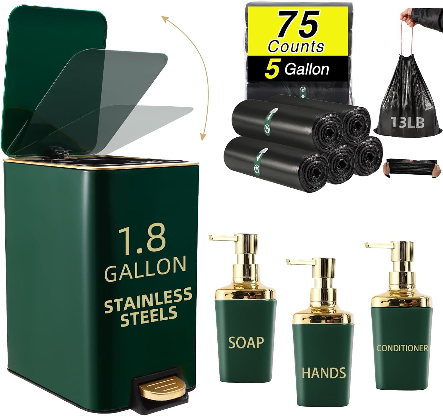 - [Package Included]:Trash can,3PCS Soap Dispenser,75 Count 5 Gallon Trash Bag,6 Waterproof Tags. each accessory is carefully selected to meet your daily needs.Our black and gold bathroom set is not only practical but also beautiful, making your bathroom space more neat and comfortable