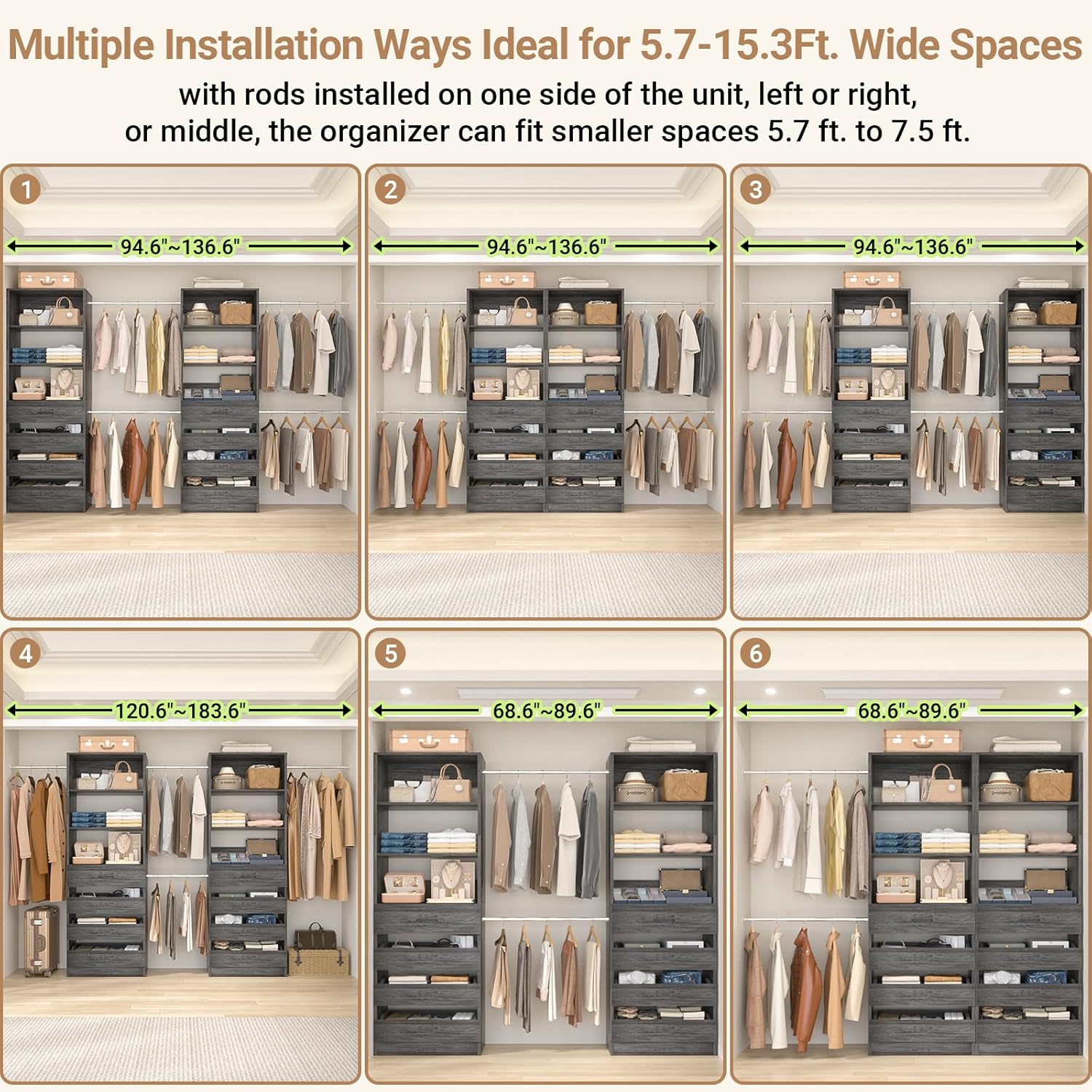 - 【Customize and DIY Your Dream Walk-in Closet】With 4 expandable hanging rods and 2 closet towers, you can easily create a personalized closet system tailored to your space. Home organization system for closet spaces to store shirts, jackets, sweaters, pants, shoes, or other décor items. Multiple Installation Ways Ideal for 6-15Ft. Wide Spaces.
