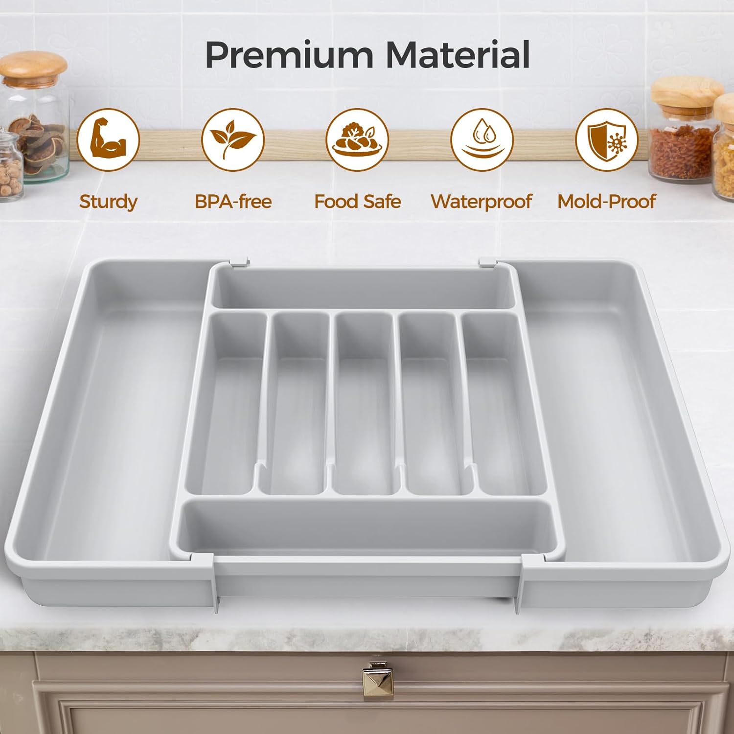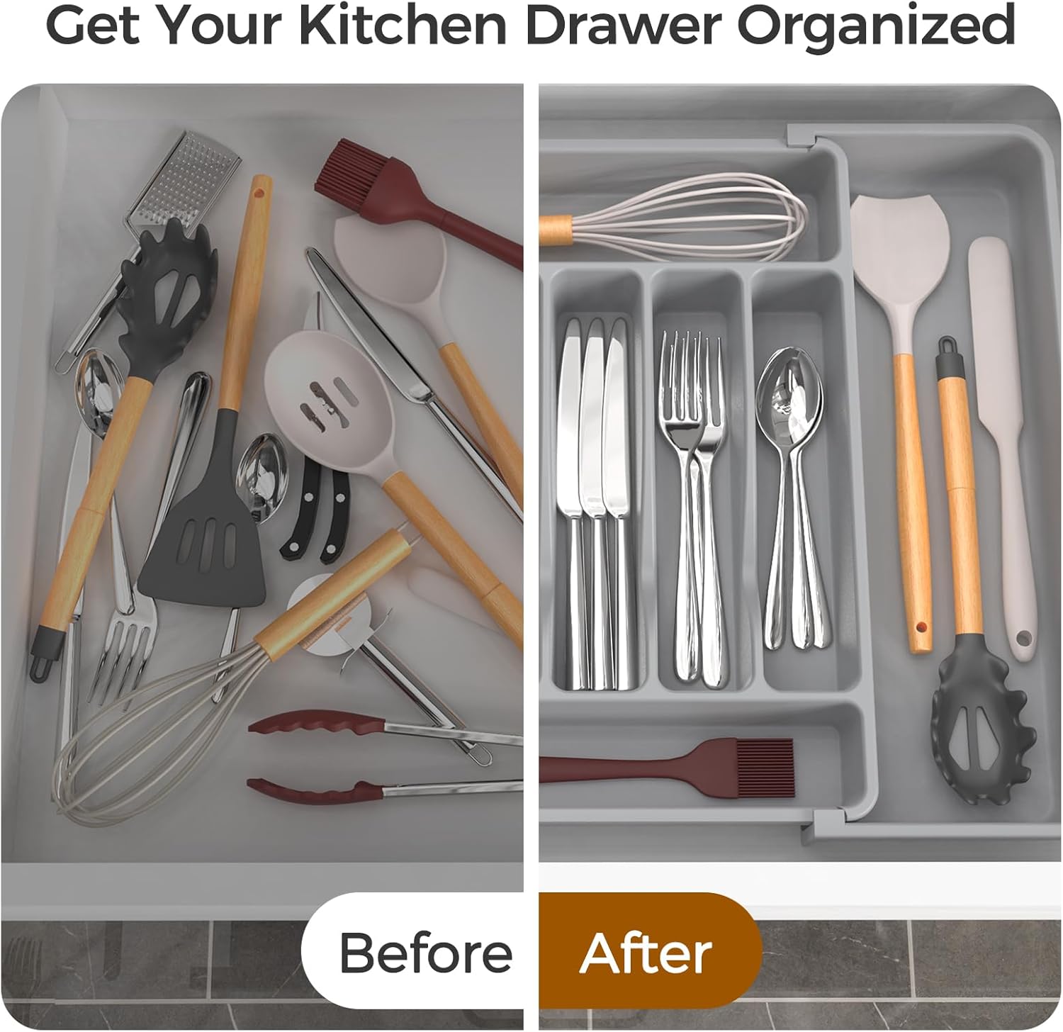 - 【Adjustable Size】:The width of the utensil drawer organizer expands from 12.4" to 21", perfectly fitting most standard drawers. (Measure your drawer before buying for the best fit).