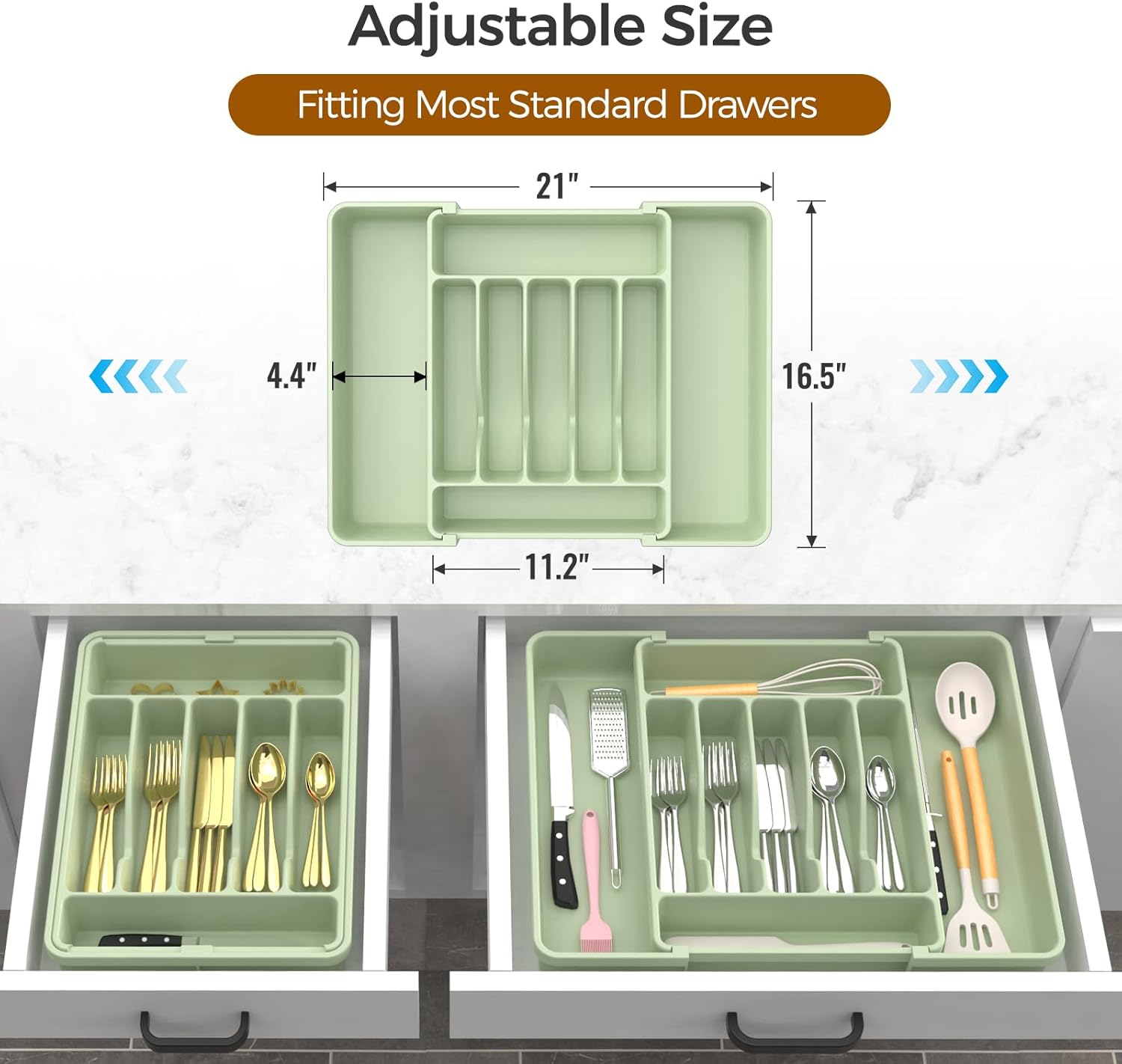 - 【Adjustable Size】:The width of the utensil drawer organizer expands from 12.4" to 21", perfectly fitting most standard drawers. (Measure your drawer before buying for the best fit).