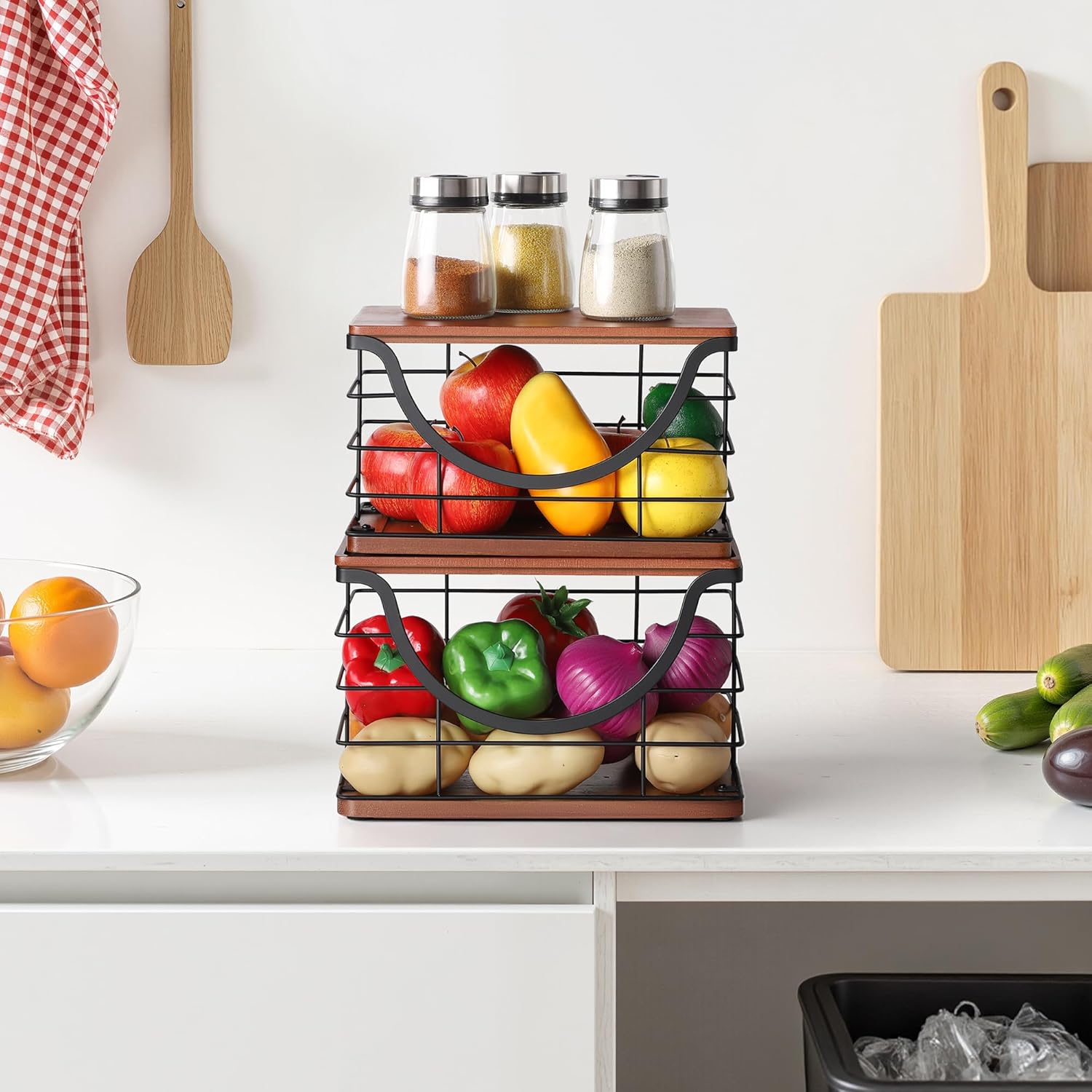 - 2 Ways to Use -stackable wire basket with bamboo top can be used on a tabletop or self-adhesive wall mounted. No need to drill holes, won't damage the wall. Multi-functional Garbage Bag Storage Dispenser is suitable for kitchen, laundry room, toilet, under the sink, cabinet, etc., you can store laundry supplies, cleaning supplies, vegetables and fruits, snacks and so on