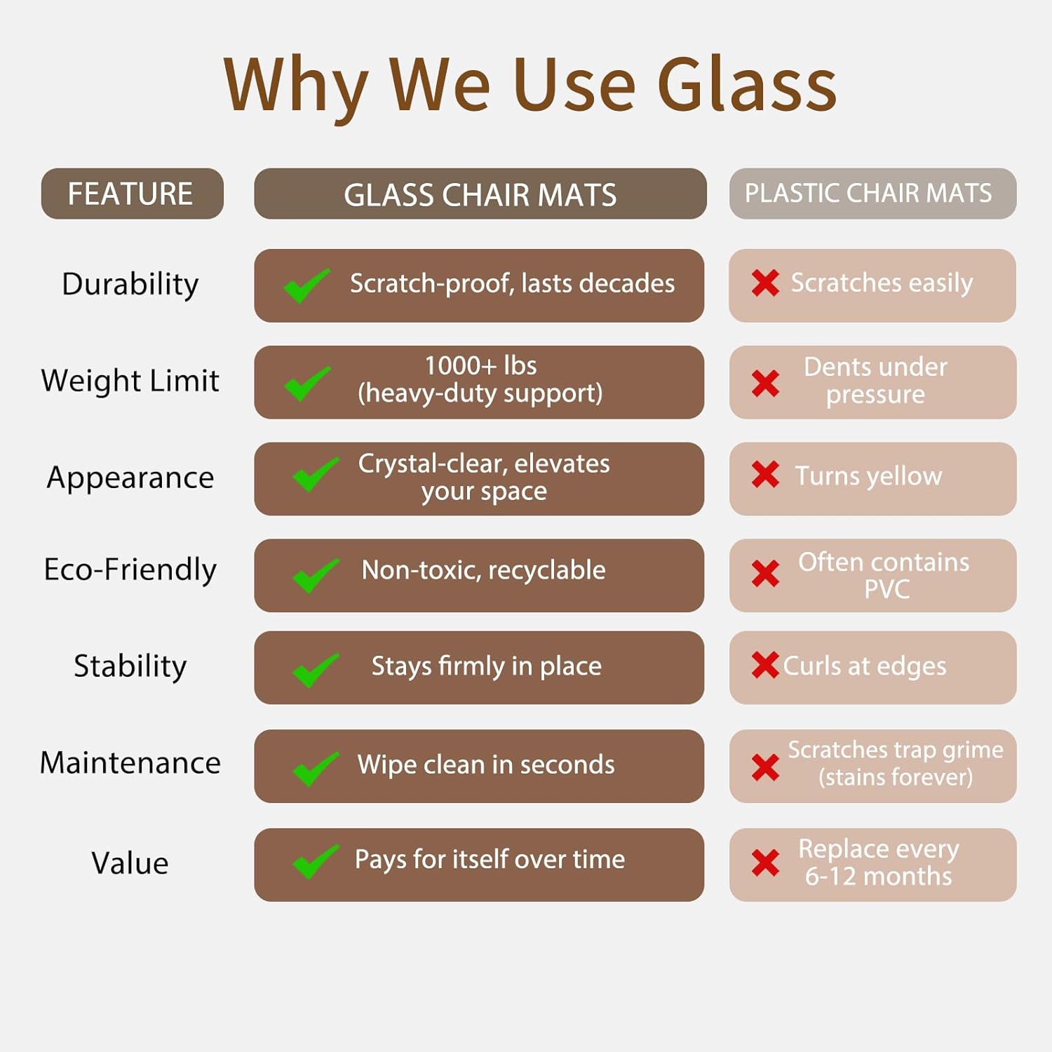 - Crystal-Clear Transparency for Floor Visibility:The high-transparency glass allows your carpet’s design or hardwood’s grain to show through naturally. It provides ample coverage for workspace mobility while blending seamlessly into your décor. No more cloudy or yellowed mats obscuring your floors.