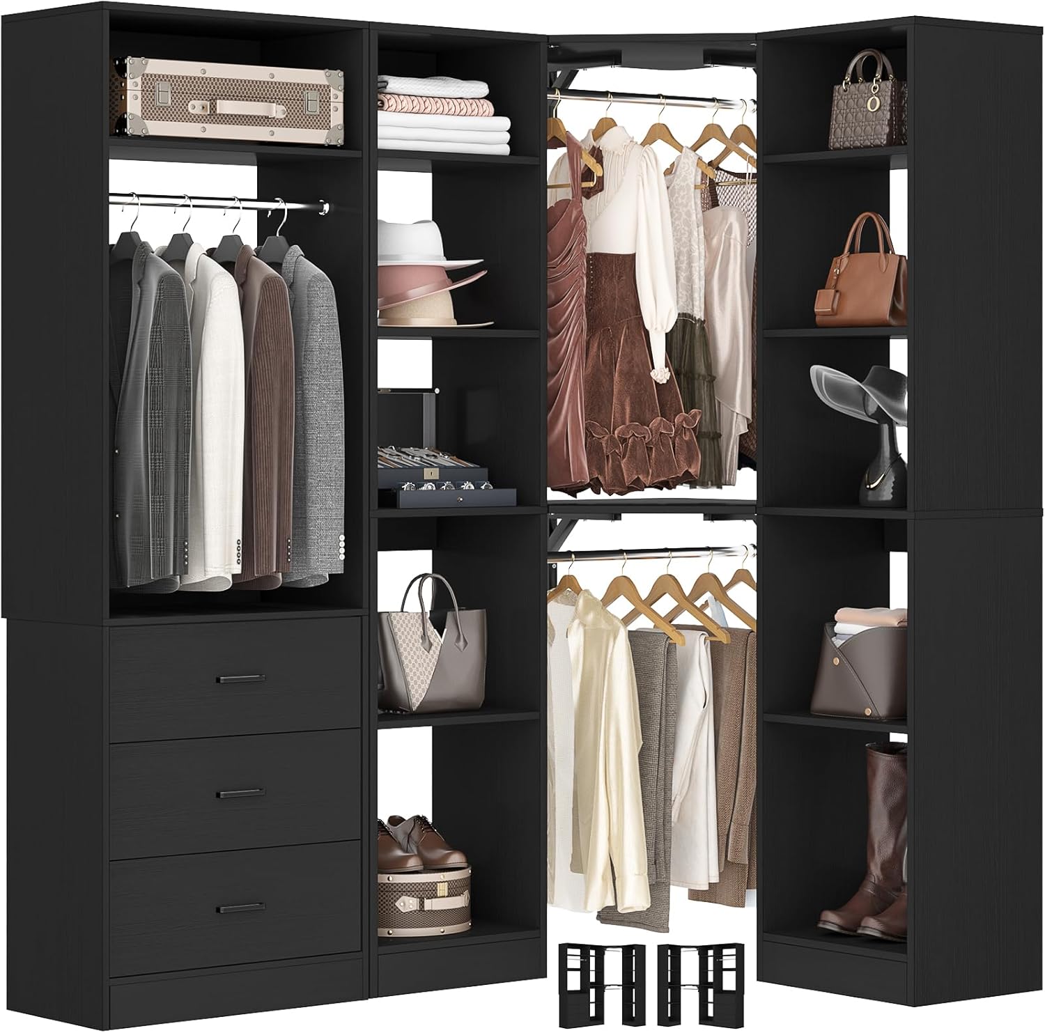 Corner Closet System with 3 Drawers, Corner Closet Organizer System with 13 Shelves & 3 Hanging Rods, 63.2"L * 39.2"W Reversible L Shaped Walk-in Closets, Load 2000+LBS, Black