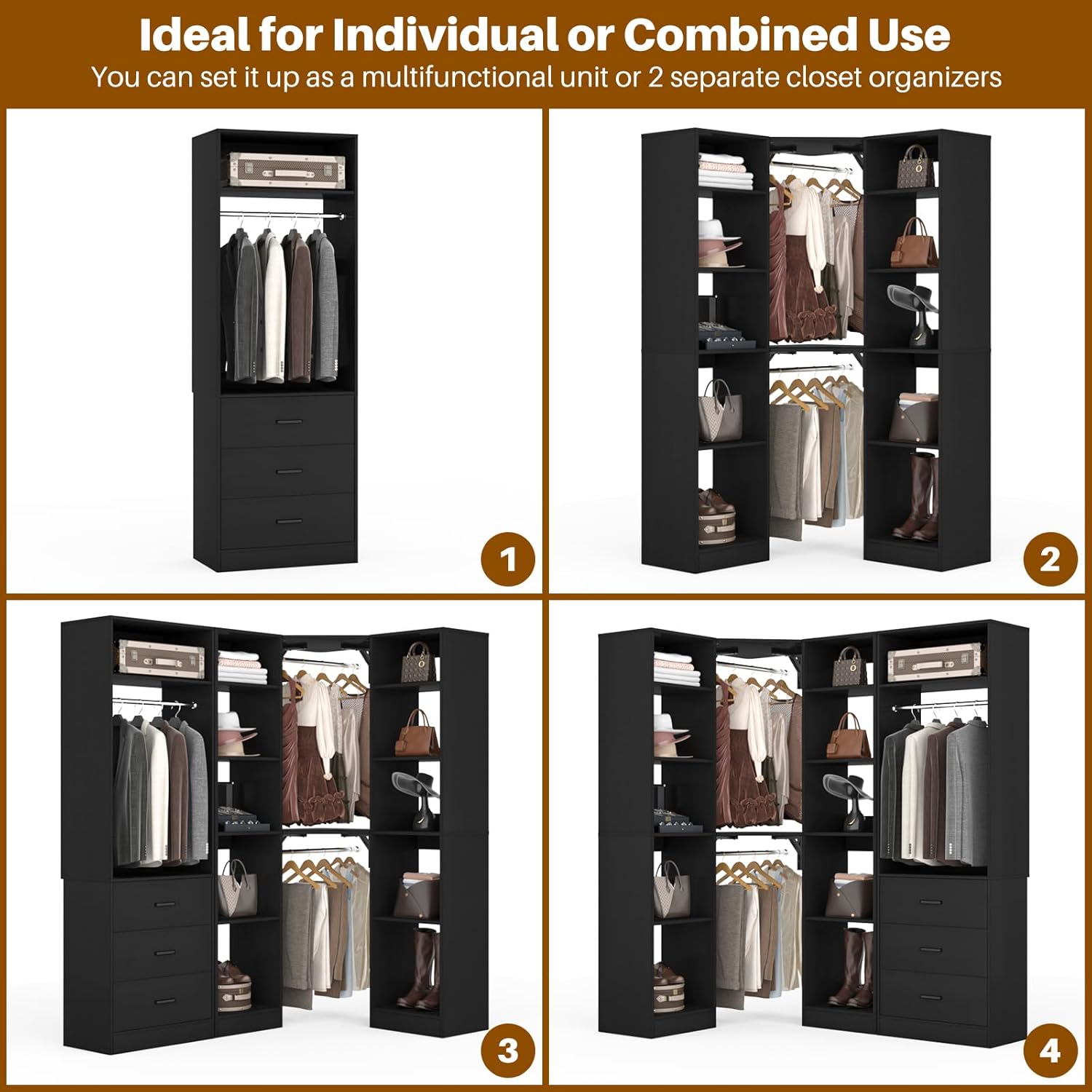 - DIY Customize Your Dream Walk-in Closet: Our closet systems put the design in your hands, allowing you to DIY to your liking. You have the flexibility to mix and match different modules based on room size, personal style and storage requirements to create an dreamful L- or U-shaped walk-in closet.