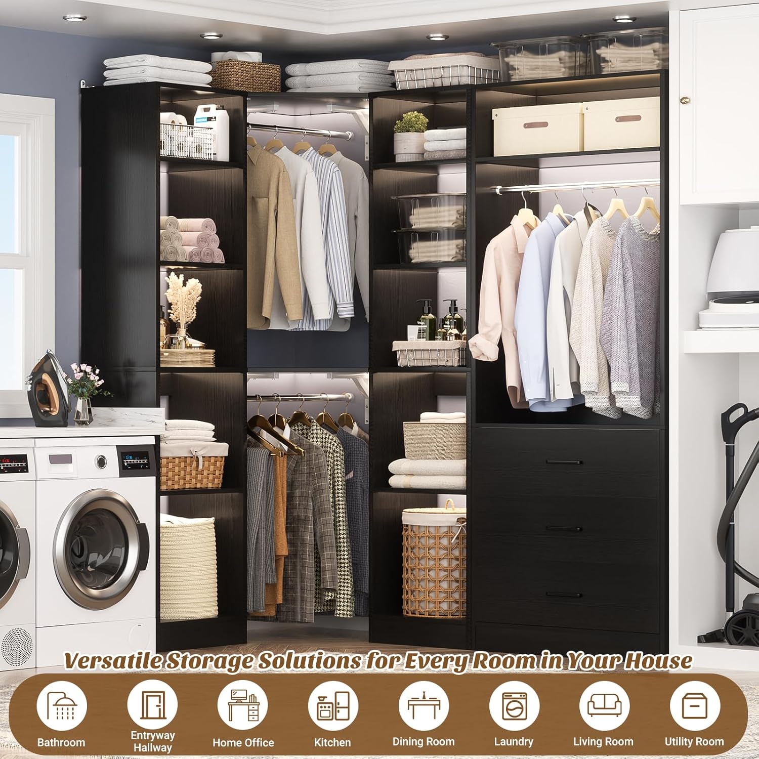 - Versatile Closet System with 2 Sets: This 63.2" large corner closet system is versatile and can be set up as a multi-functional unit or as 2 separate closet systems that can be used for checkrooms, pantries, laundry rooms or food storage, making it suitable for storage in any room throughout your house.