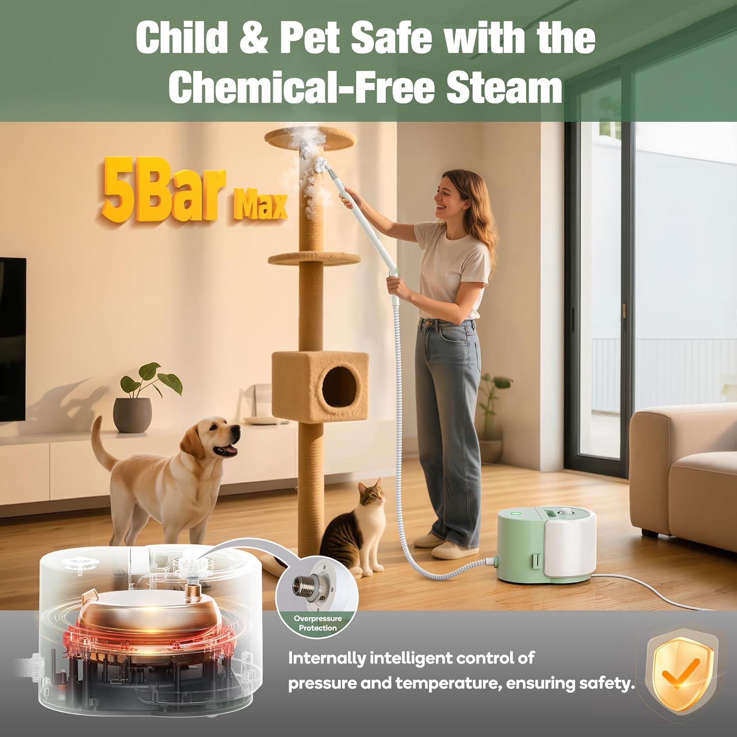 - [Multi-Layer Safety Mechanism]​​ Engineered with pressure and temperature controls, this system ensures stable, consistent operation. With an advanced safety valve, overpressure protection enhances safety by preventing pressure buildup—while steam-only cleaning keeps it friendly to kids and pets and kills bacteria without harsh chemicals. NOTE: Designed for 110~125-volt outlets only.