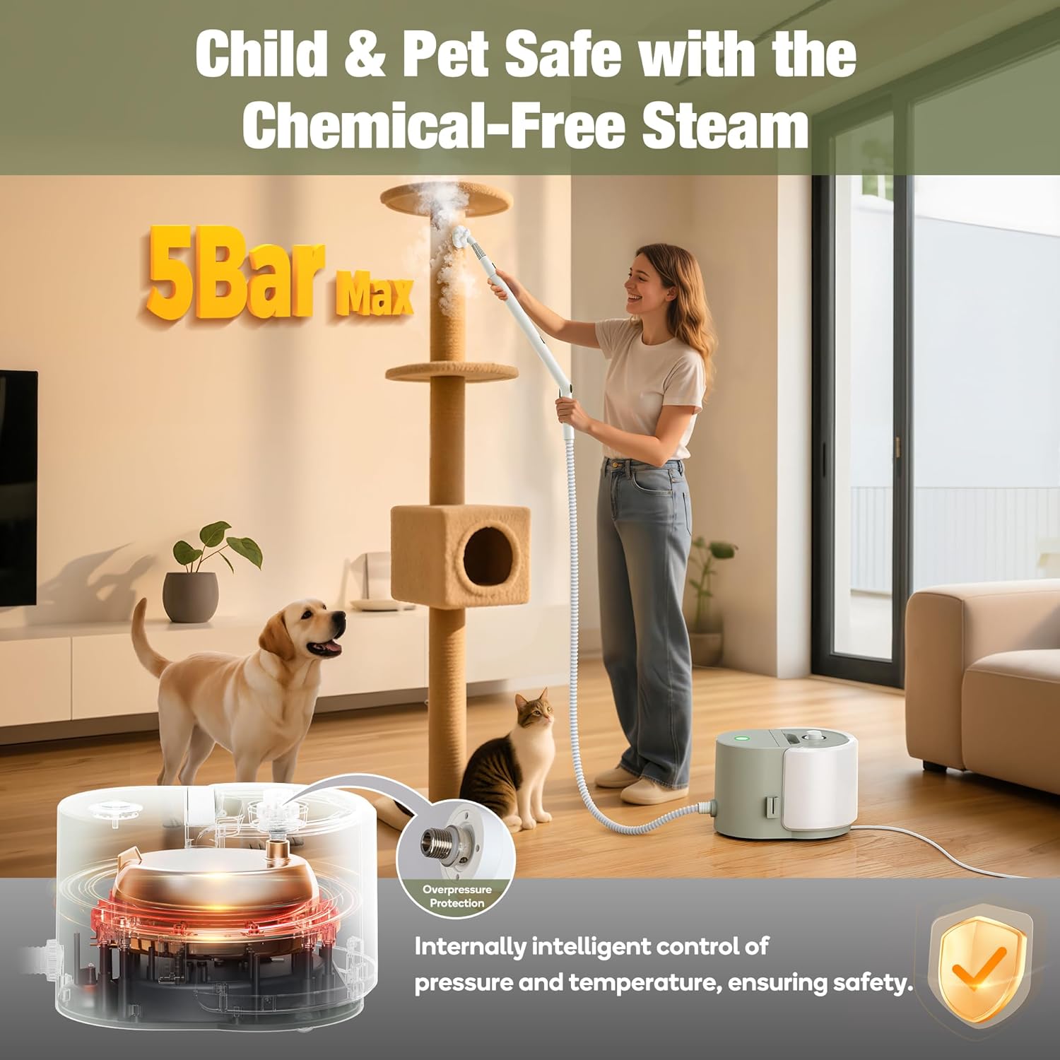 - ​[Multi-Layer Safety Mechanism] Engineered with pressure and temperature controls, this system ensures stable, consistent operation. With an advanced safety valve, overpressure protection enhances safety by preventing pressure buildup—while steam-only cleaning keeps it friendly to kids and pets. NOTE: Designed for 110~125-volt outlets only.