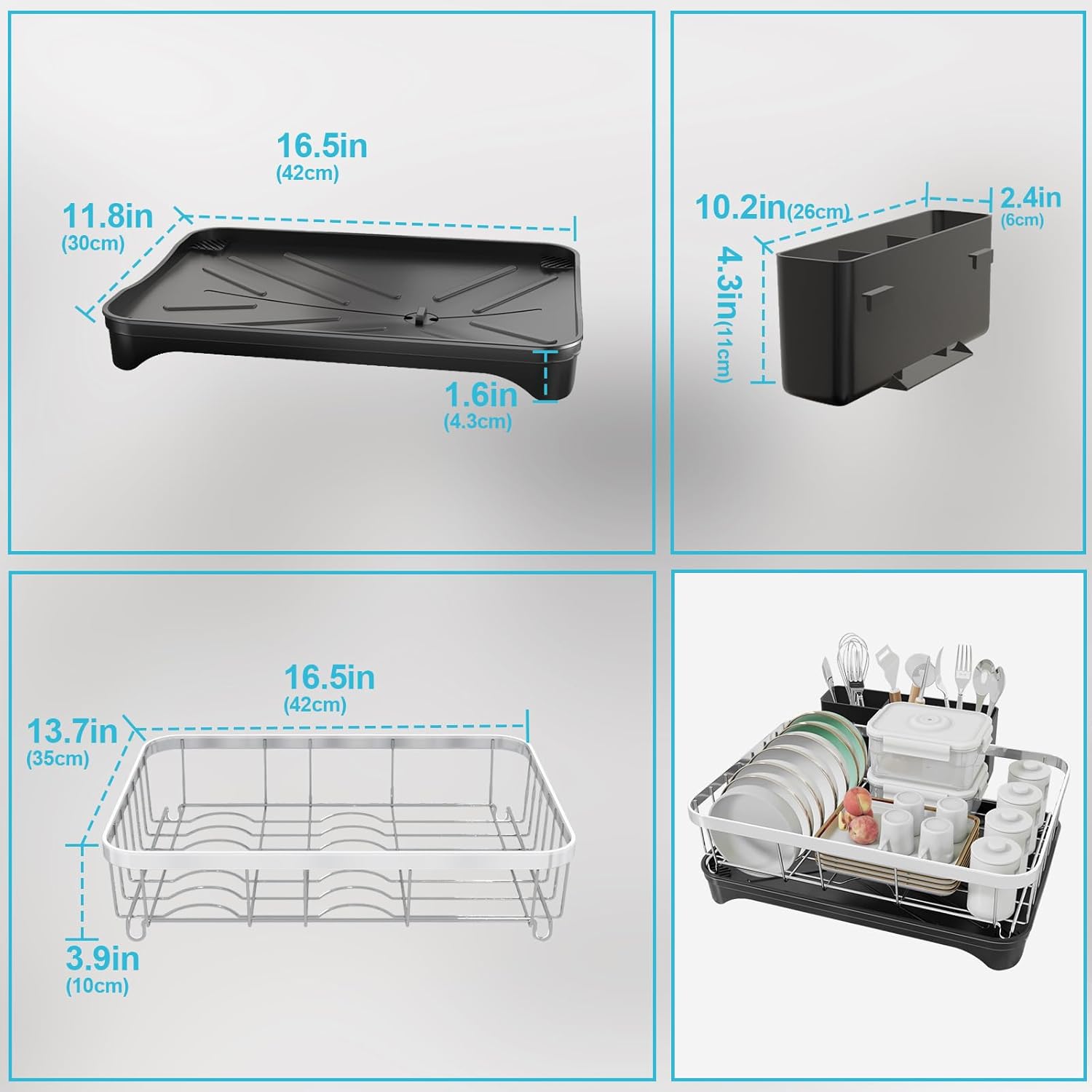 - Compact Size Dish Rack :The utensil drying rack measures 16.5"L x 12"W x 5.3"H. Despite its compact dimensions, it offers ample space to hold over 10 items of various sizes, such as bowls, glass bottles, and spice jars. This makes it an ideal choice for saving countertop space.