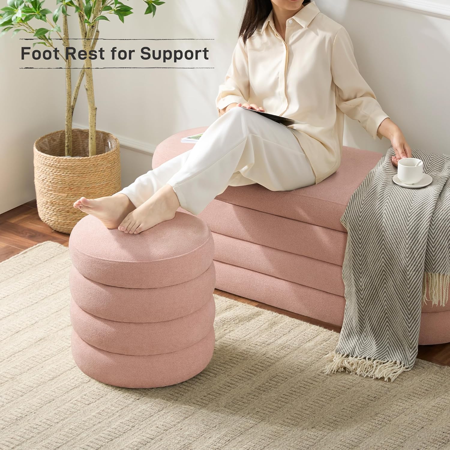 - MULTIFUNCTIONAL ROUND OTTOMAN:This storage stool ottoman features a chic and elegant circular design, making it ideal for the bedroom, living room, as a vanity stool, or in the entryway. Whether used for extra seating, as a small coffee table, or as a footrest, the ottoman seamlessly fits into various home settings.