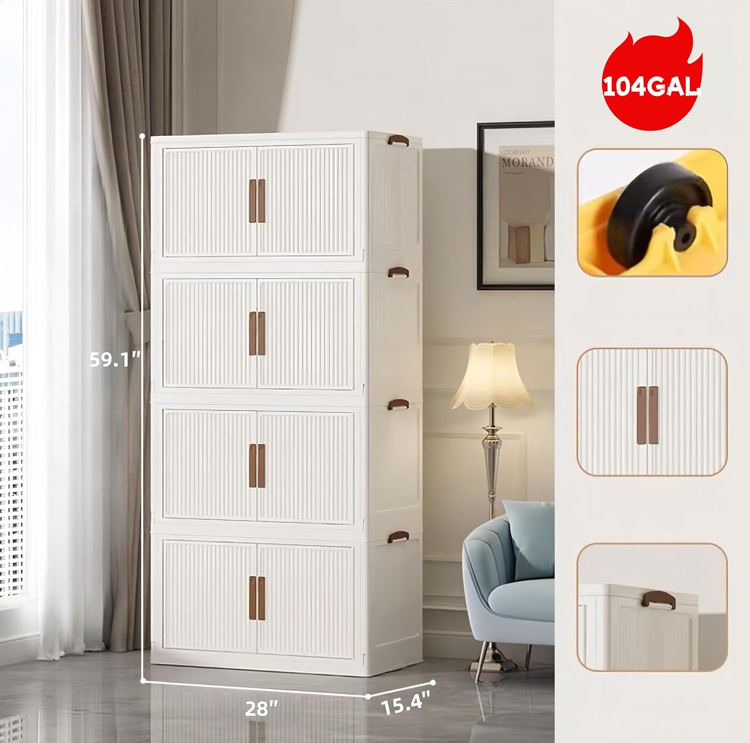 Stackable Storage Bins with Lid 44Gal/176QT Plastic Collapsible Storage Cabinet 4 Tiers Foldable clothes Organizers and Storage bins with Wheels and Doors for Home Office White