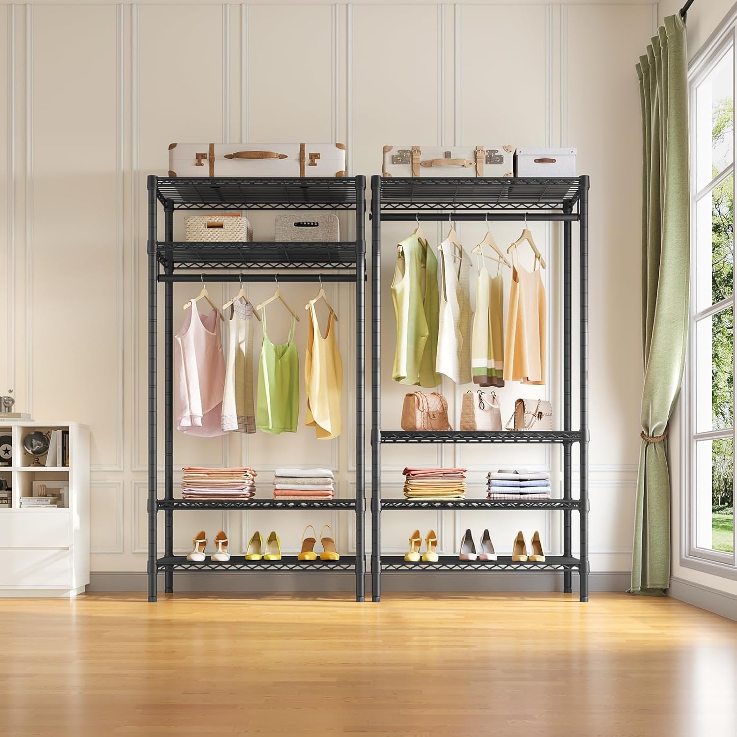 - 【Ample Storage Place】 The Garment Rack is designed with 4 tiers shelves and hanger rod, provide ample storage place, supporting a max load of 420lbs. Perfect for clothes, bags, box, shoes, accessories, or other household items