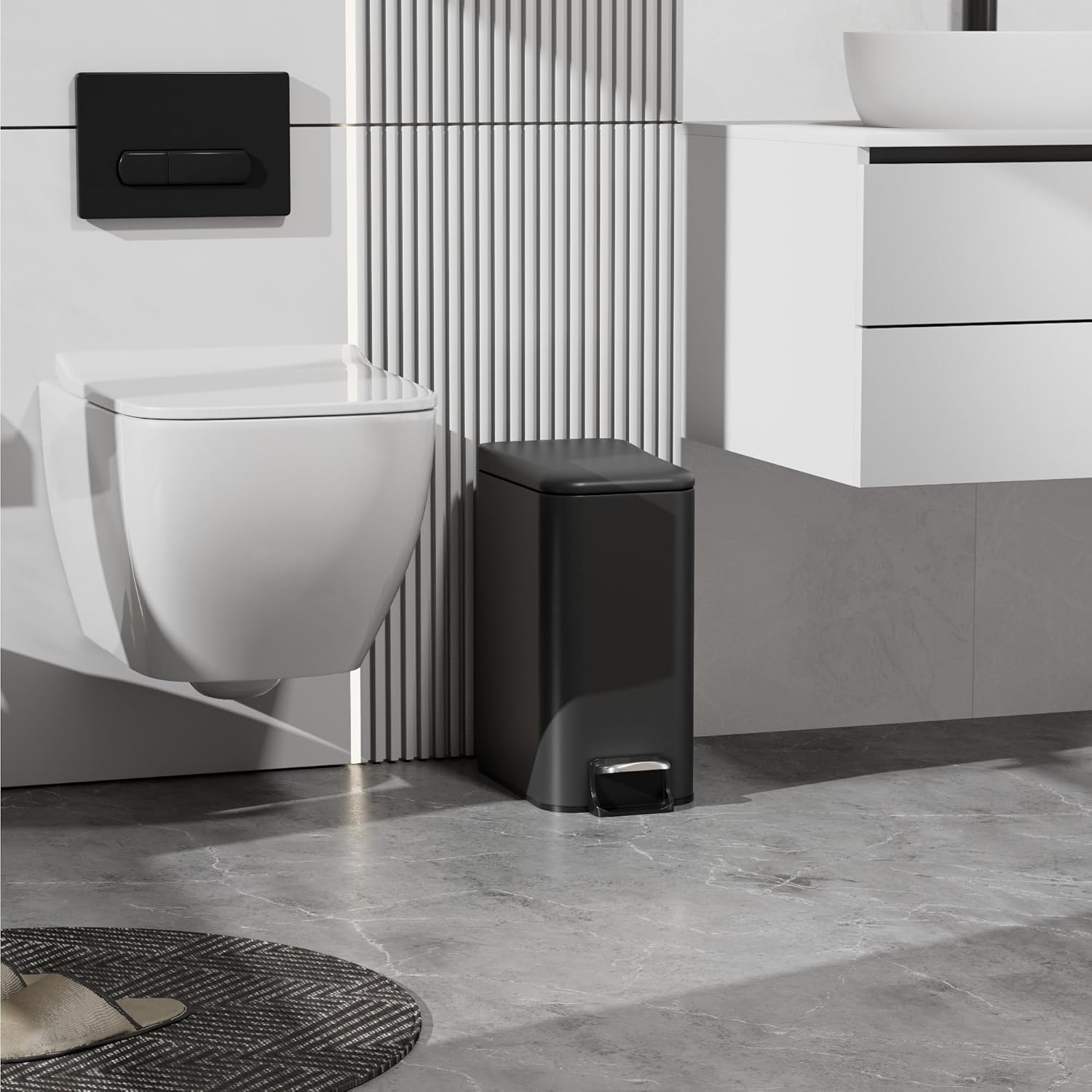 Small Trash Can with Lid Soft-Close, 6 L/1.6 Gal Bathroom Garbage Can with Removable Inner Bucket, Step Pedal, Stainless Steel Wastebasket for Kitchen, Bathroom, Bedroom, Office, Matt Black