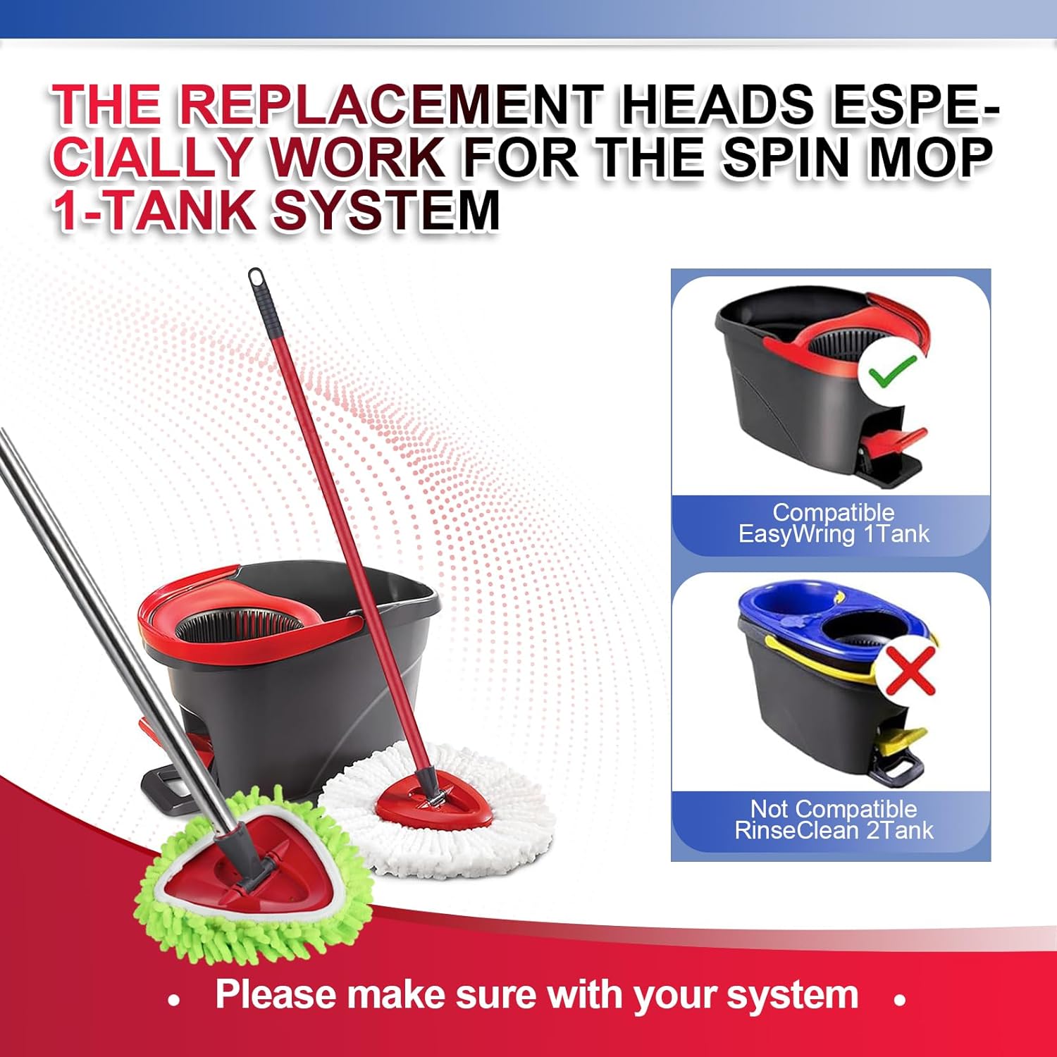 - Package Included:Upgraded brush.There are 3 Elastic Green Mop + 2 White Microfiber Spin Mop Head + One Scrub Brush + One Base.All the head are for O-Ceda EasyWring Microfiber Spin Mop,compatible with Ocedar 1-Tank system, NOT for 2-Tanks Rinse Clean system.Double replacement use together,provide the deep cleaning.