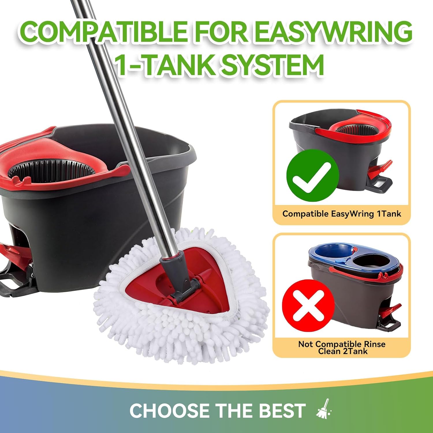 - Package Included:Upgraded brush.There are 3 Elastic Green Mop + 2 White Microfiber Spin Mop Head + One Scrub Brush + One Base.All the head are for O-Ceda EasyWring Microfiber Spin Mop,compatible with Ocedar 1-Tank system, NOT for 2-Tanks Rinse Clean system.Double replacement use together,provide the deep cleaning.