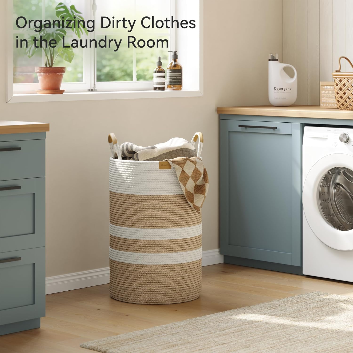 75L Striped Laundry Hamper with Leather Handles,Large Foldable Laundry Basket for Clothes,Cotton Rope Storage Bin for Blankets,Woven Clothes Basket for Bedroom,Beige Stripes