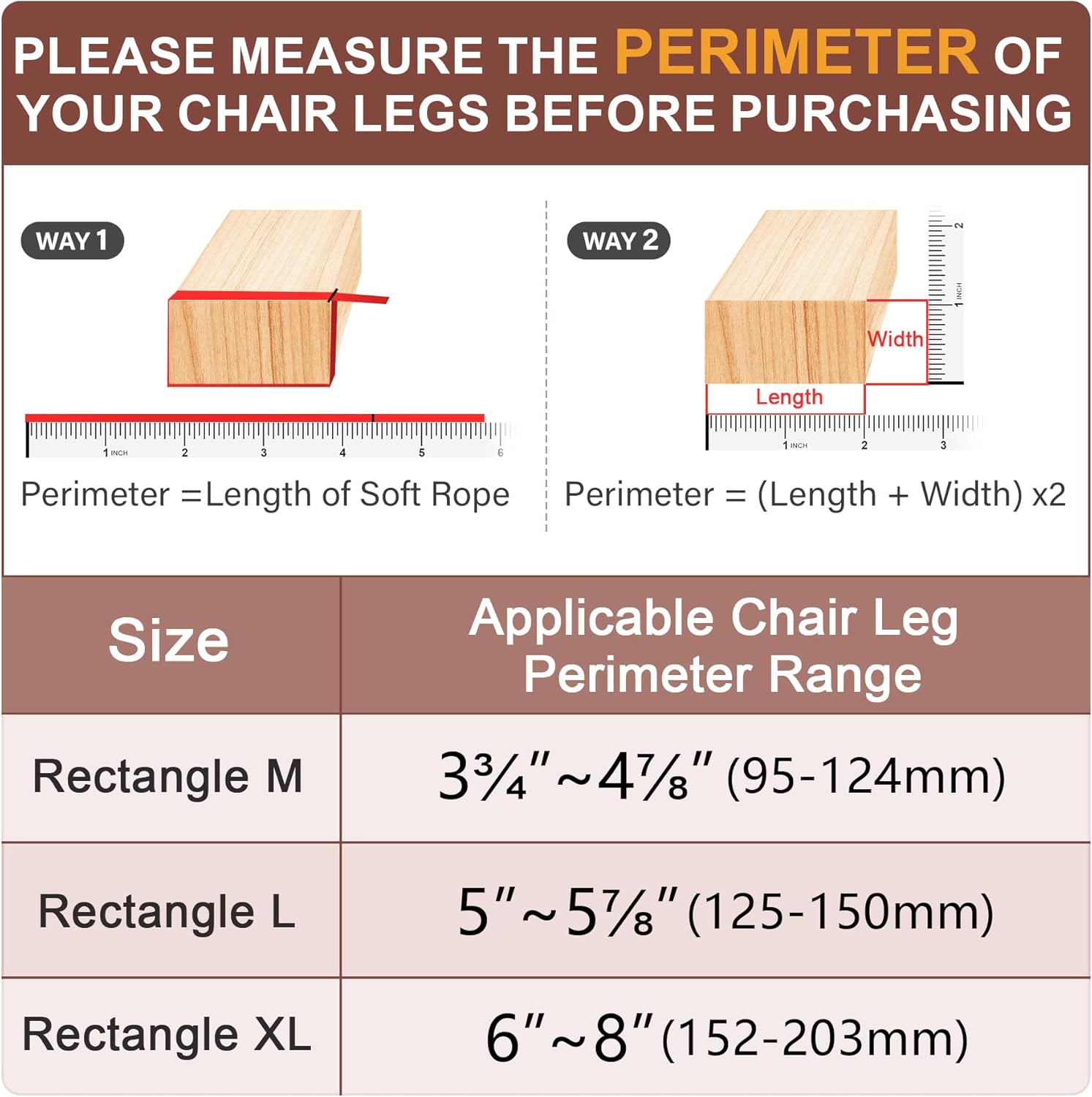 - [Stretchable Fit a Range of Sizes] Designed with a narrow top and wider bottom, these chair leg caps fit various chair legs sizes. Rectangle L size fits chair legs with a perimeter of 5" to 5‑7/8"(125–150 mm).