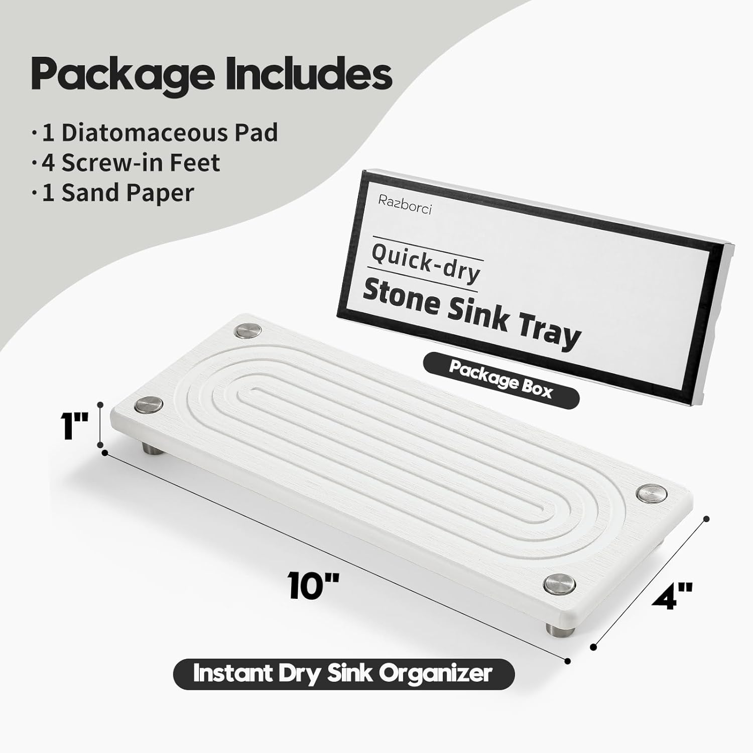 Water Absorbing Stone Sink Caddy, Diatomite Kitchen Sink Organizer, Bathroom Counter Tray, Faucet Drying Mat Coaster Soap Dish Rack Riser Dispenser Sponge Holder, Silver, White 10" x 4"