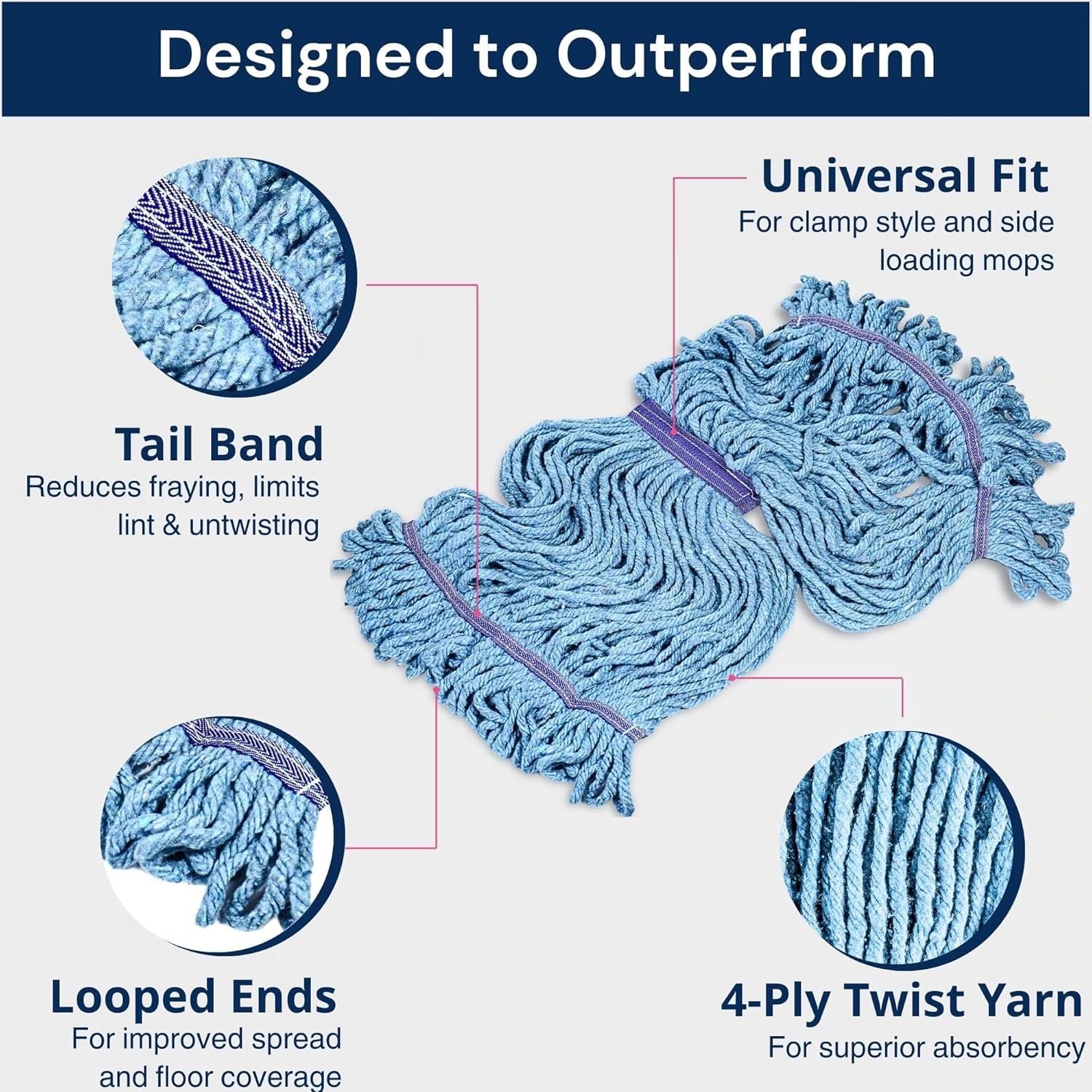 - BUILT TO LAST – Tough stitching and heavy-duty build mean you’ll mop more, replace less, and save big. Designed to outperform typical mophead replacements and cushion head cotton mop replacement head types. Whether you're stocking a case of mop heads for cleaning mop head jobs or upgrading a commercial heavy duty mop setup, this blue mop is a keeper. Resists fraying better than string mop heads or mopheads replacement, and works with any industrial mop head replacement need.